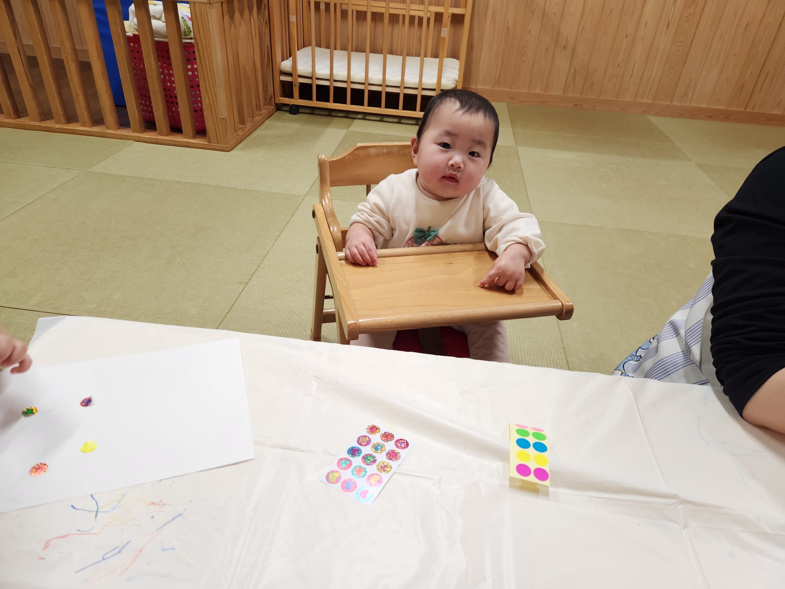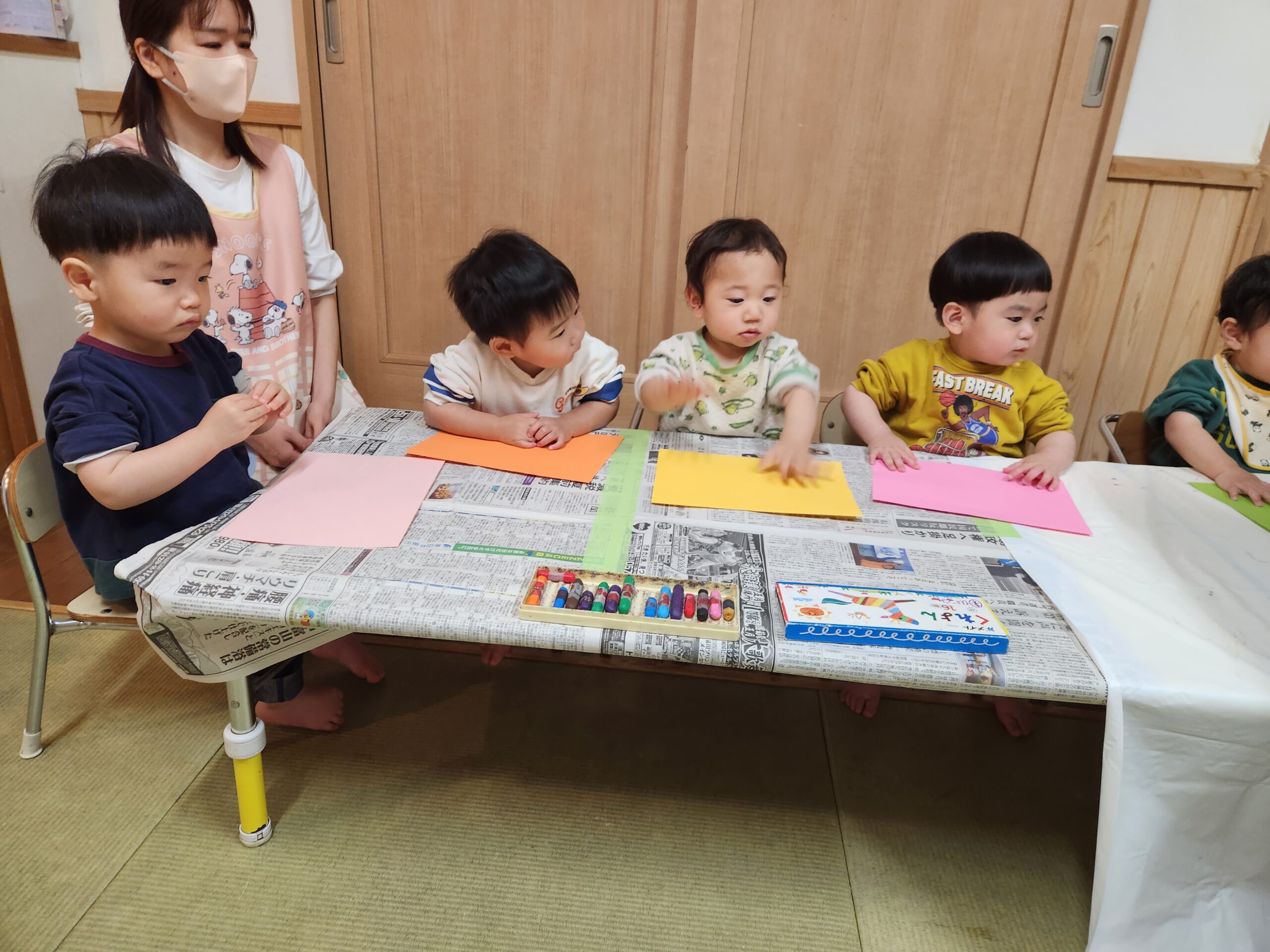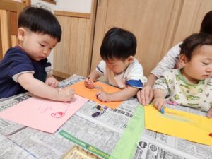 私は、みんなを応援中!クレヨンで描いたり、シールを貼ったりみんな上手だな~