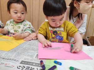 「どうぞ」と声を掛けられると、クレヨンに手を伸ばして描き始めました。