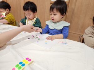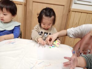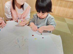 クレヨンを上下に”トントン”し、点をたくさん描くお友だちや