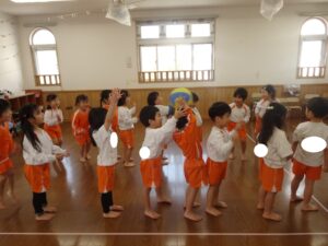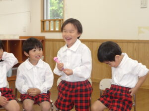 今週は、自己紹介をしたり、体操をしたり、色々なゲーム遊びを楽しみました。