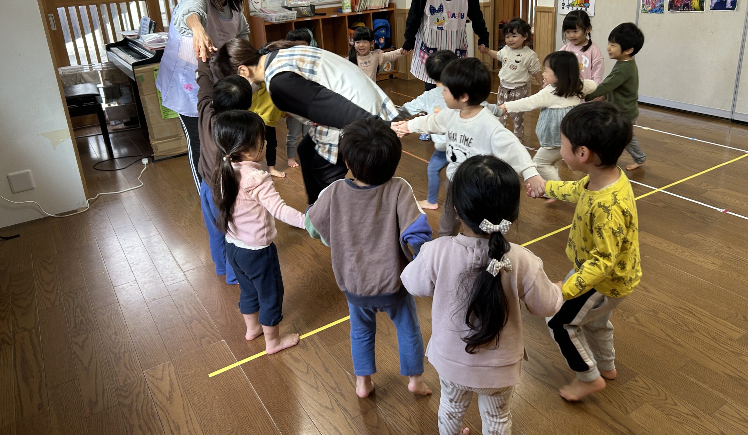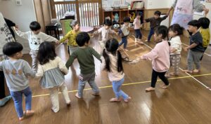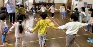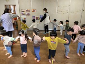 【手をつなごう~】の歌をうたいながら大きな円を作ります。