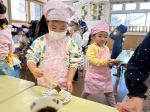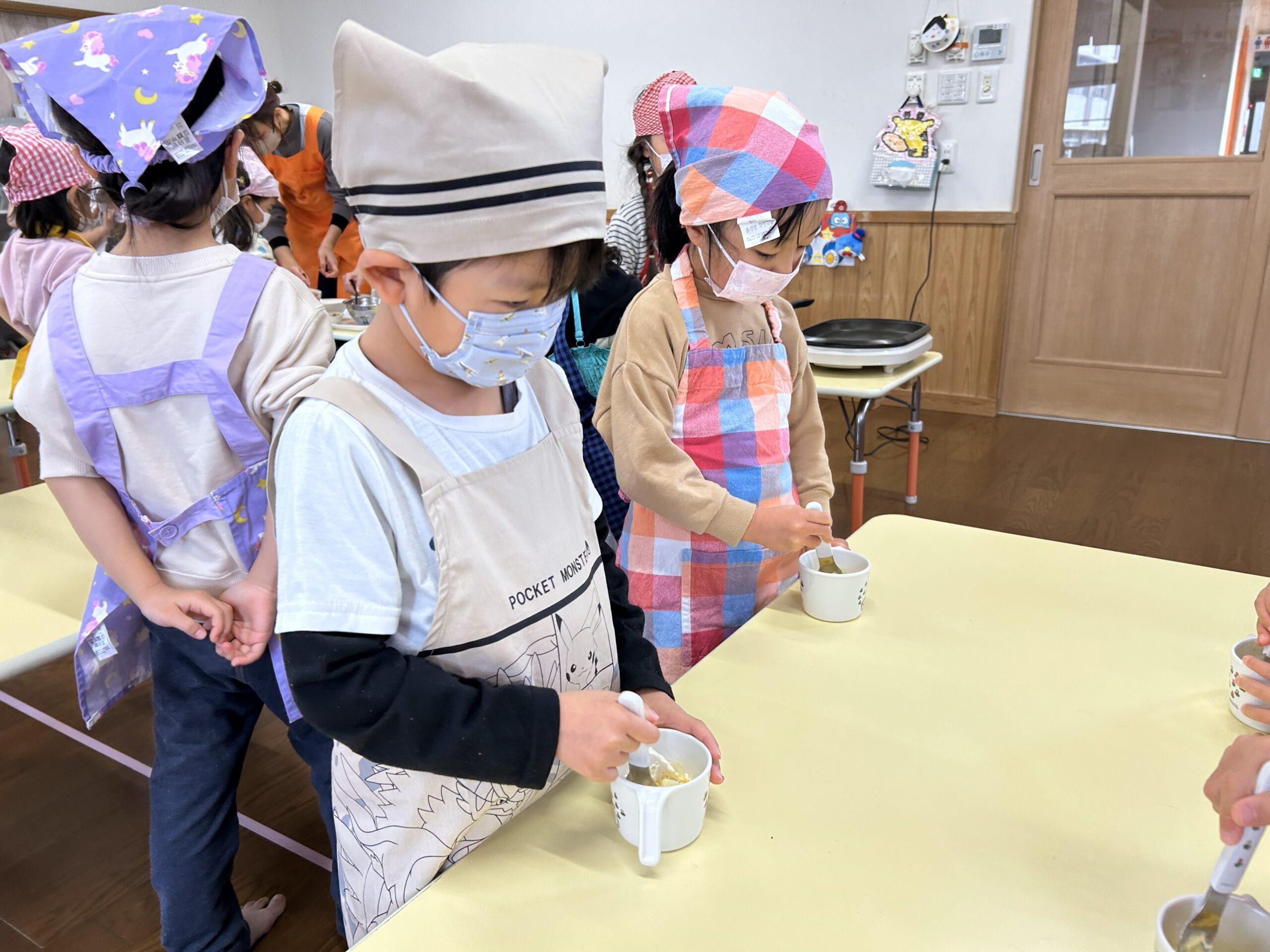 やけどをしないように、慎重にゆーっくりとホットプレートにうつしていく子どもたち👀