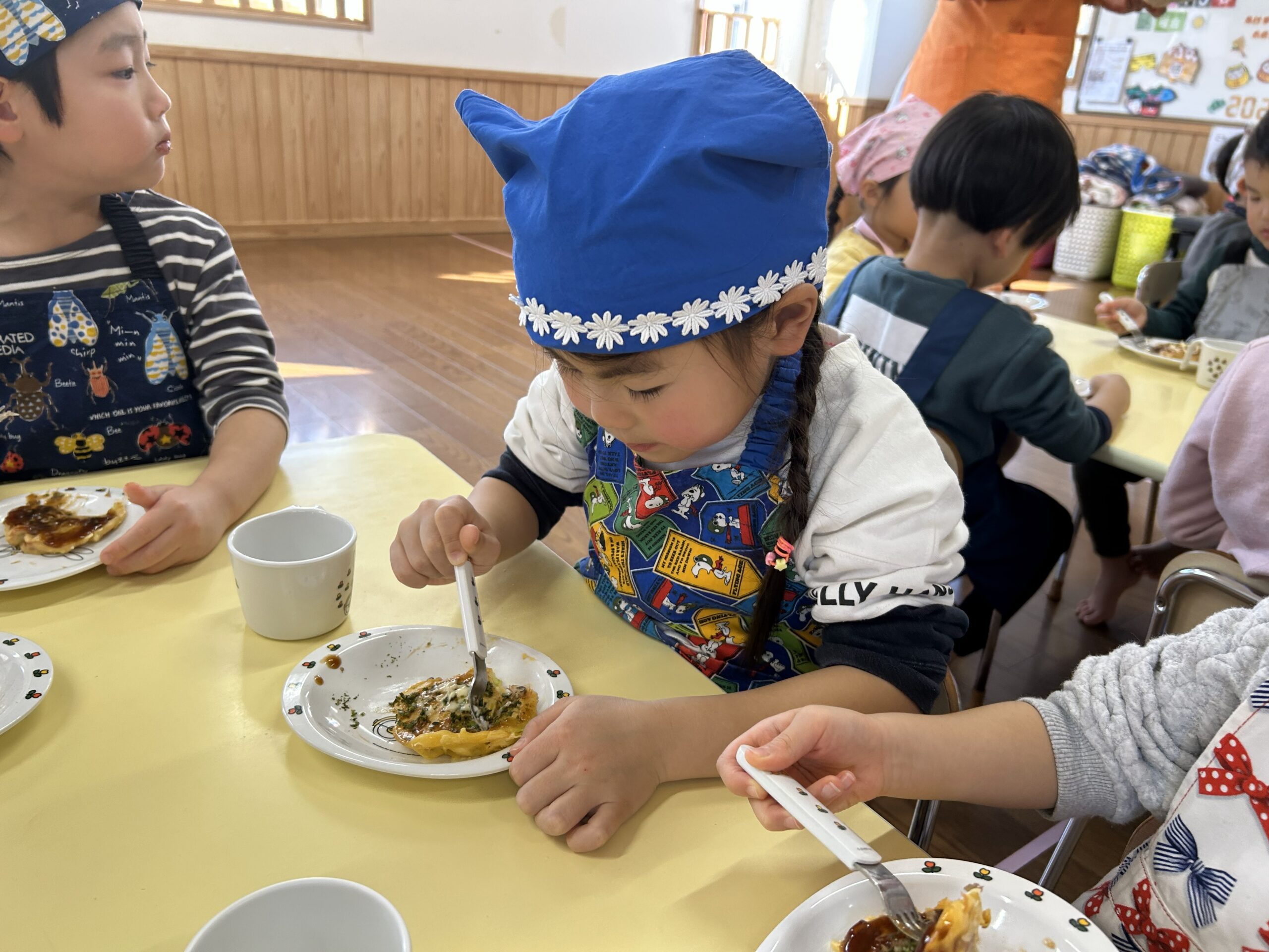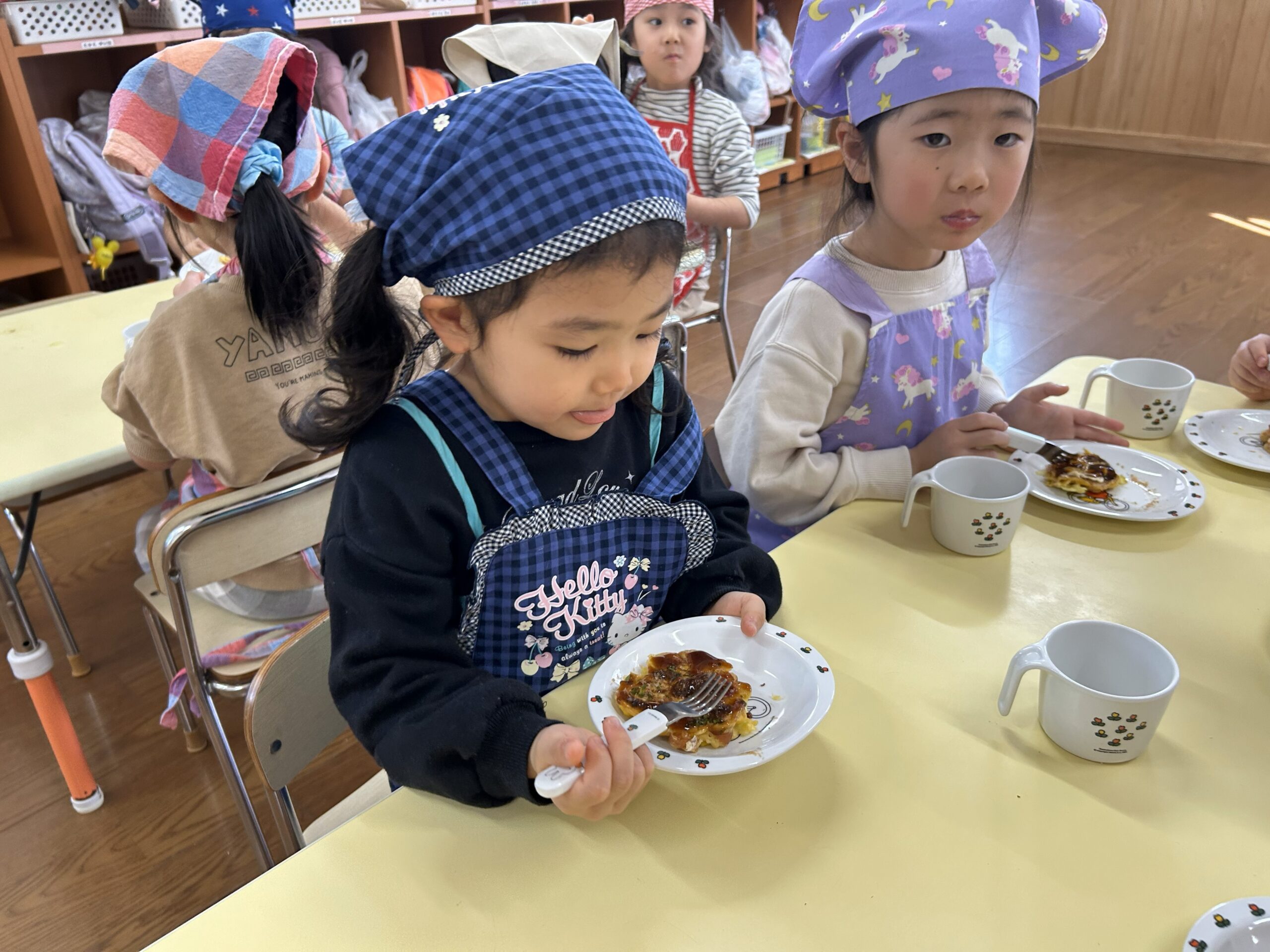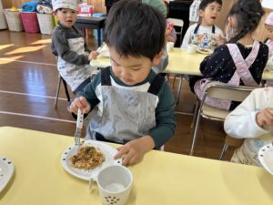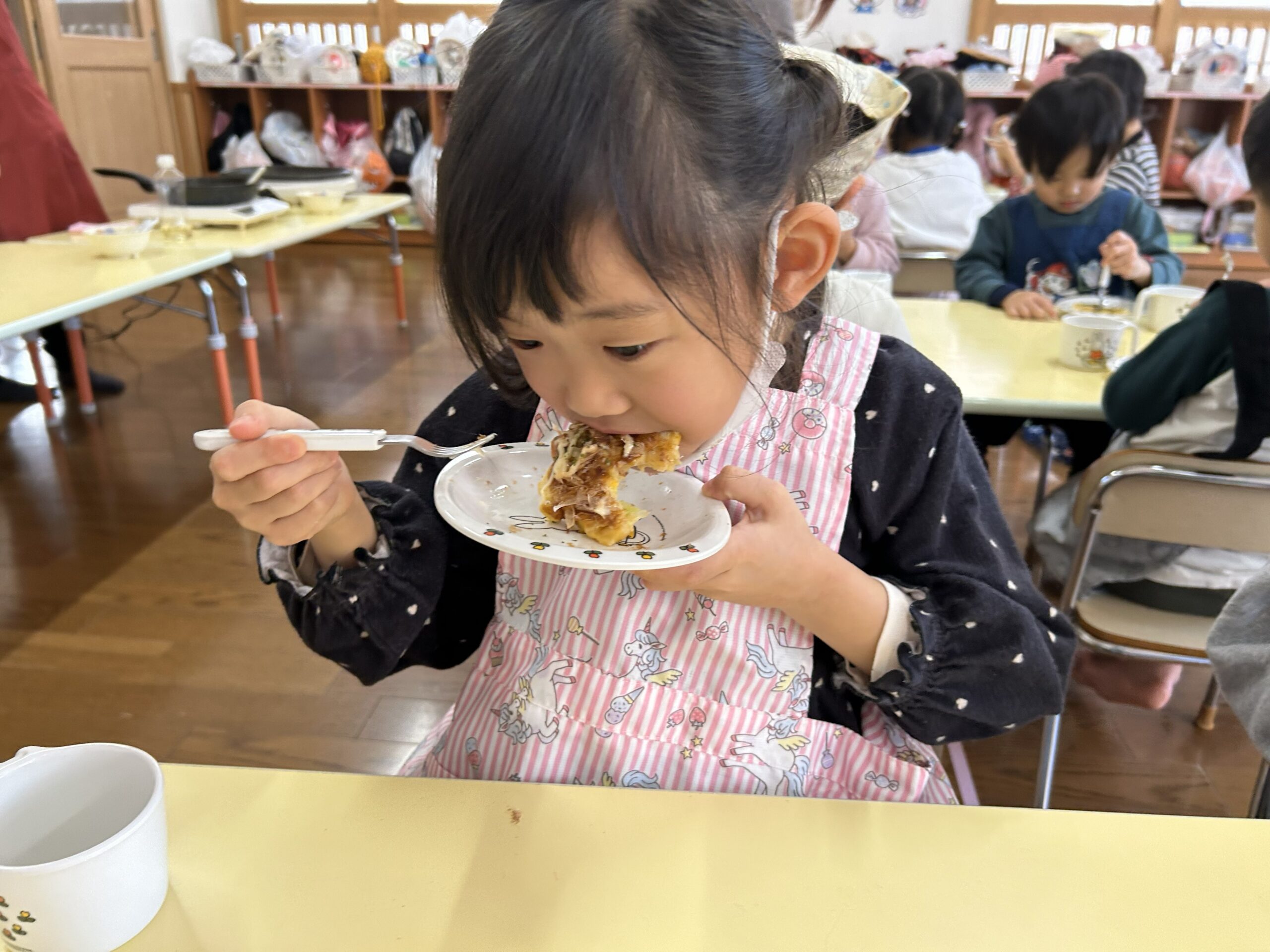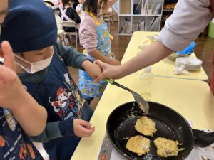 保育者のお好み焼きを見て「美味しそうだね」と目をキラキラさせて狙っている子もいました🤩