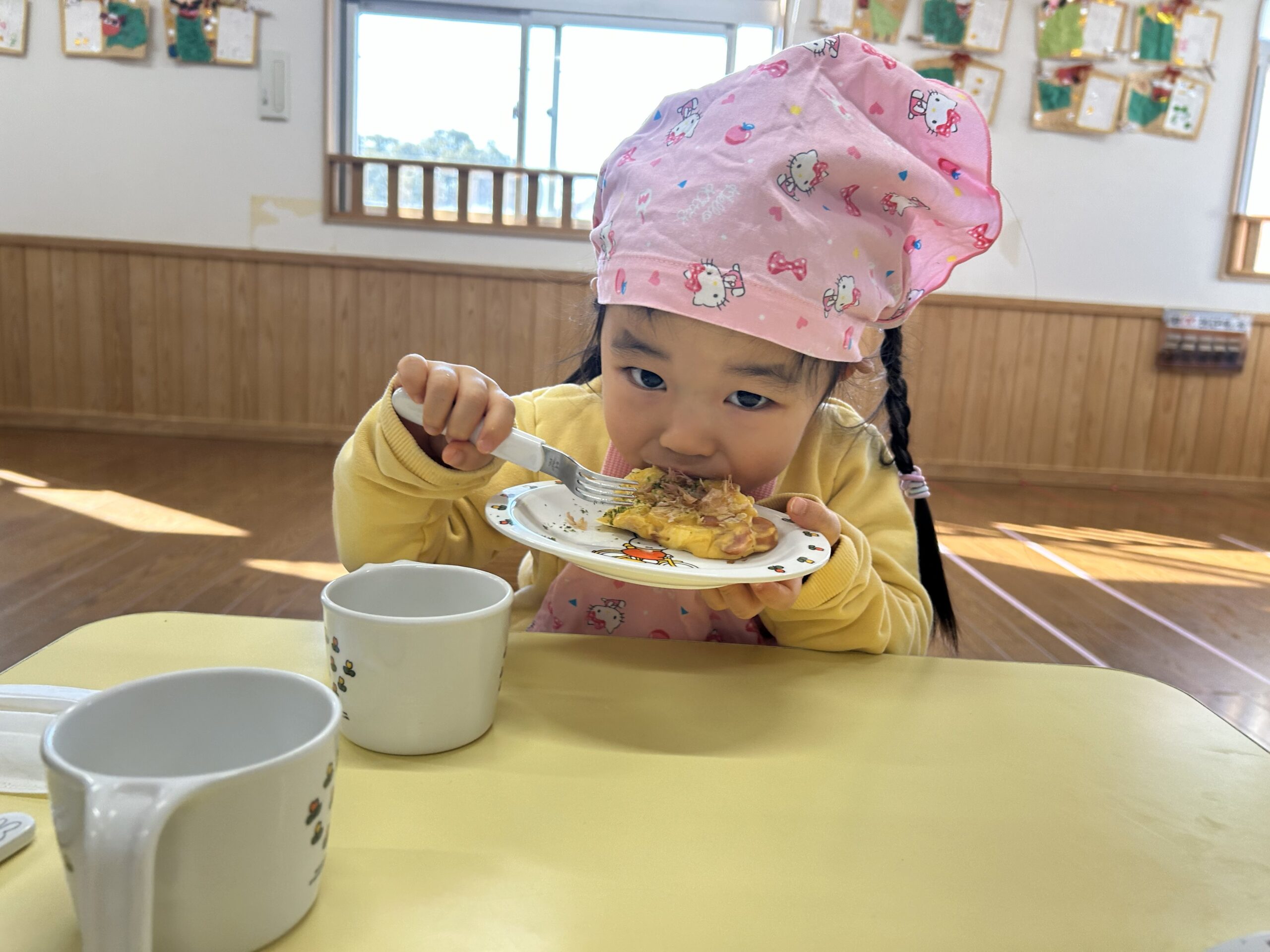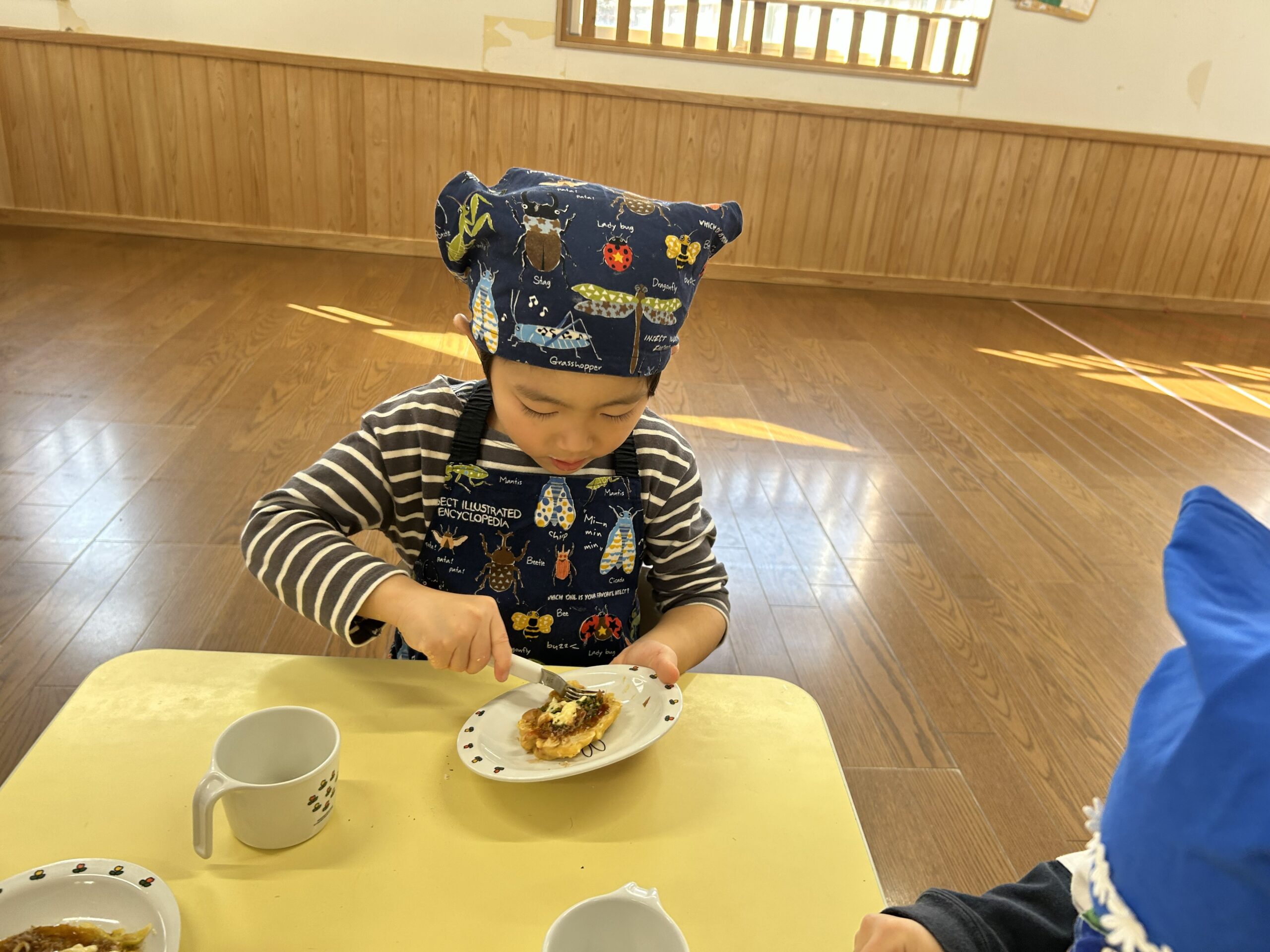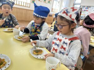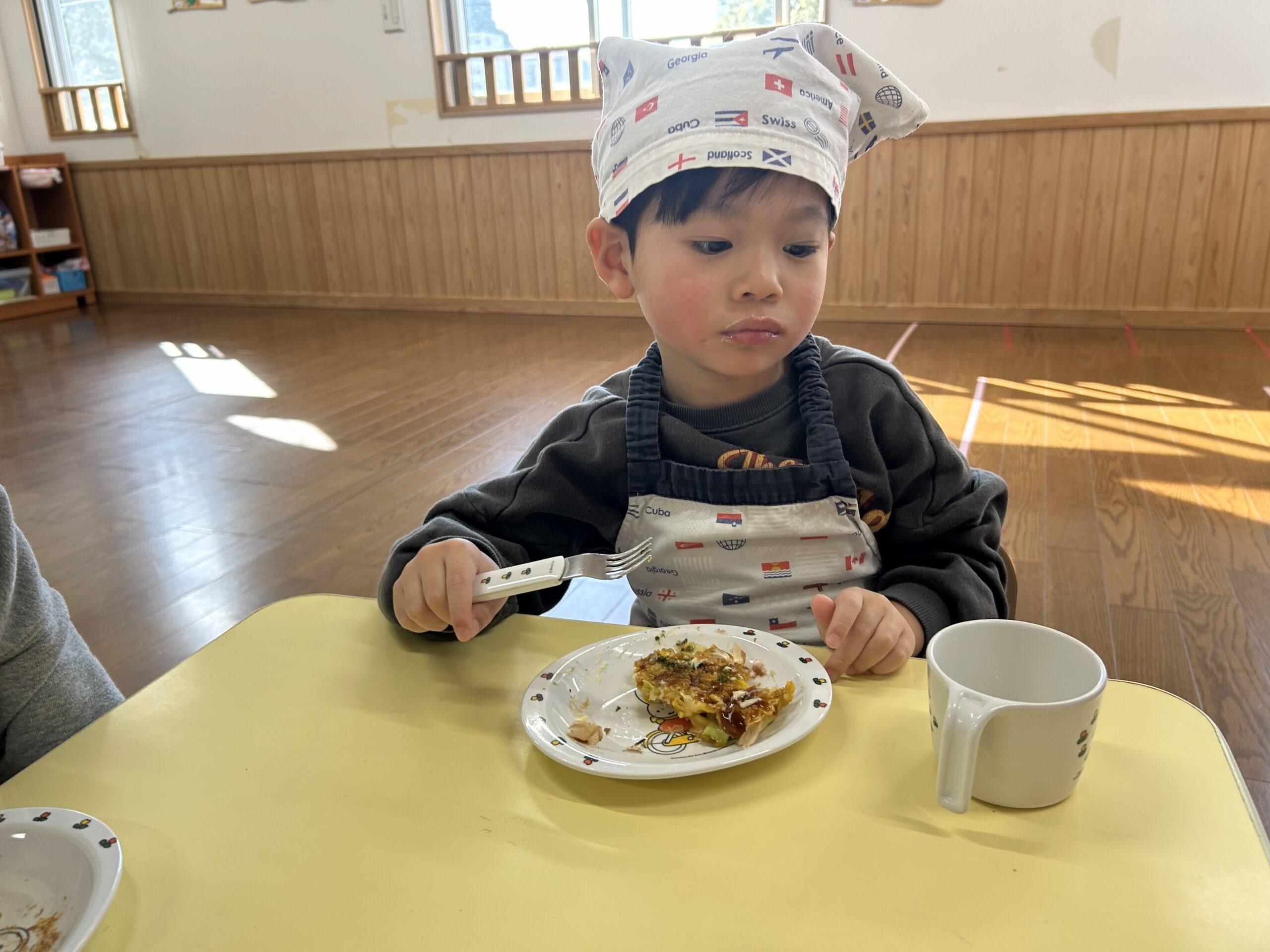 保育者のお好み焼きを見て「美味しそうだね」と目をキラキラさせて狙っている子もいました🤩