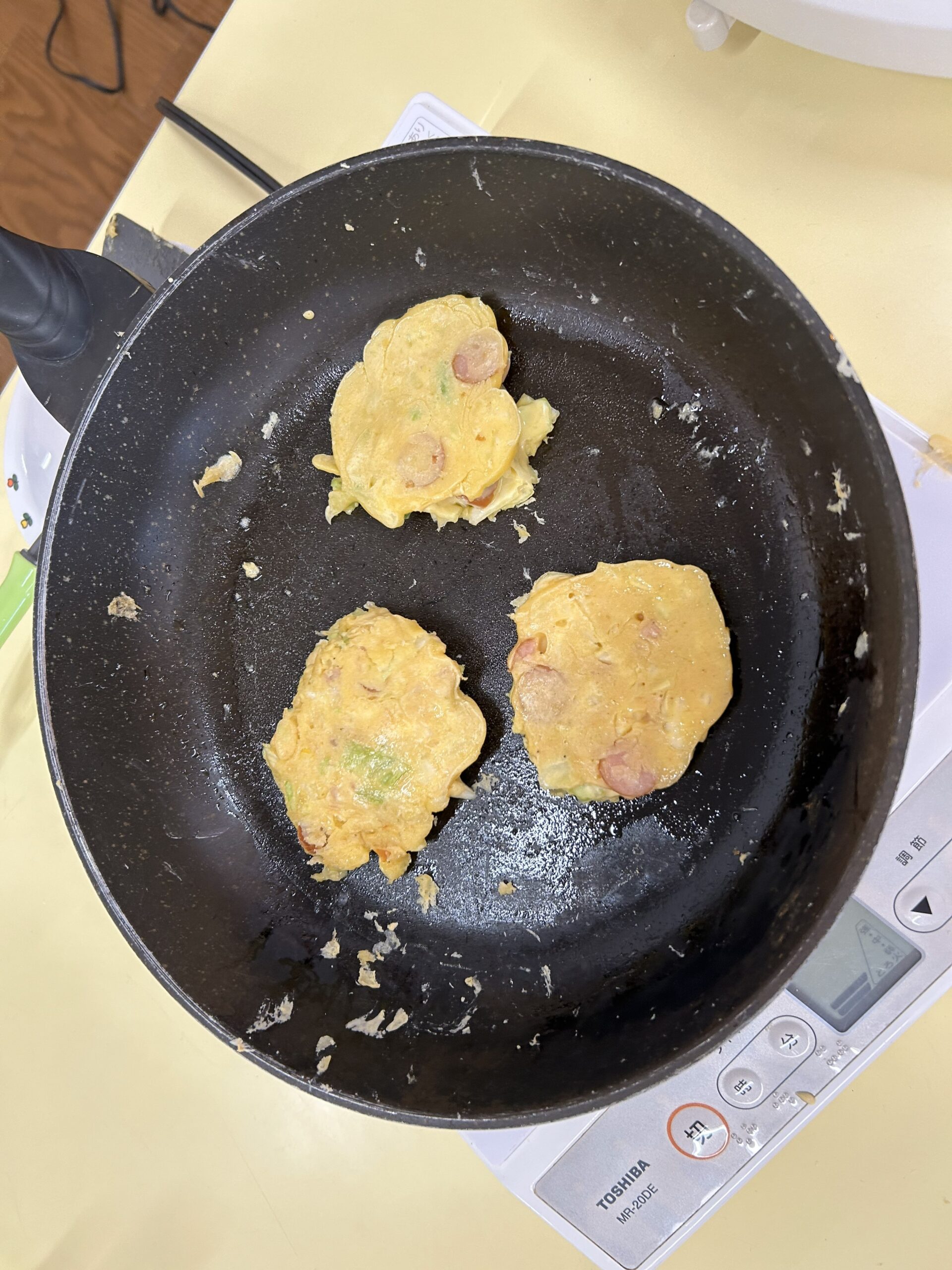片面が焼けたら、自分たちでフライ返しを使ってひっくり返しました🍳