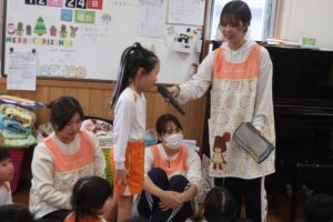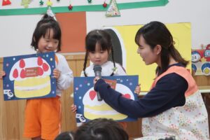 その後は、各クラスの代表のお友だちに、制作物の発表をしてもらいました。