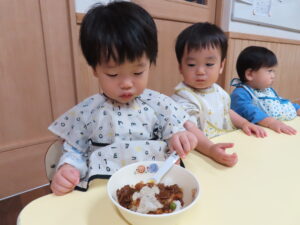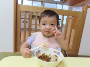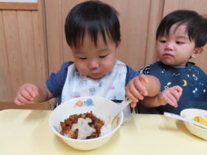 ハヤシライスの上にあるオバケにとても興味を示していましたが、、、