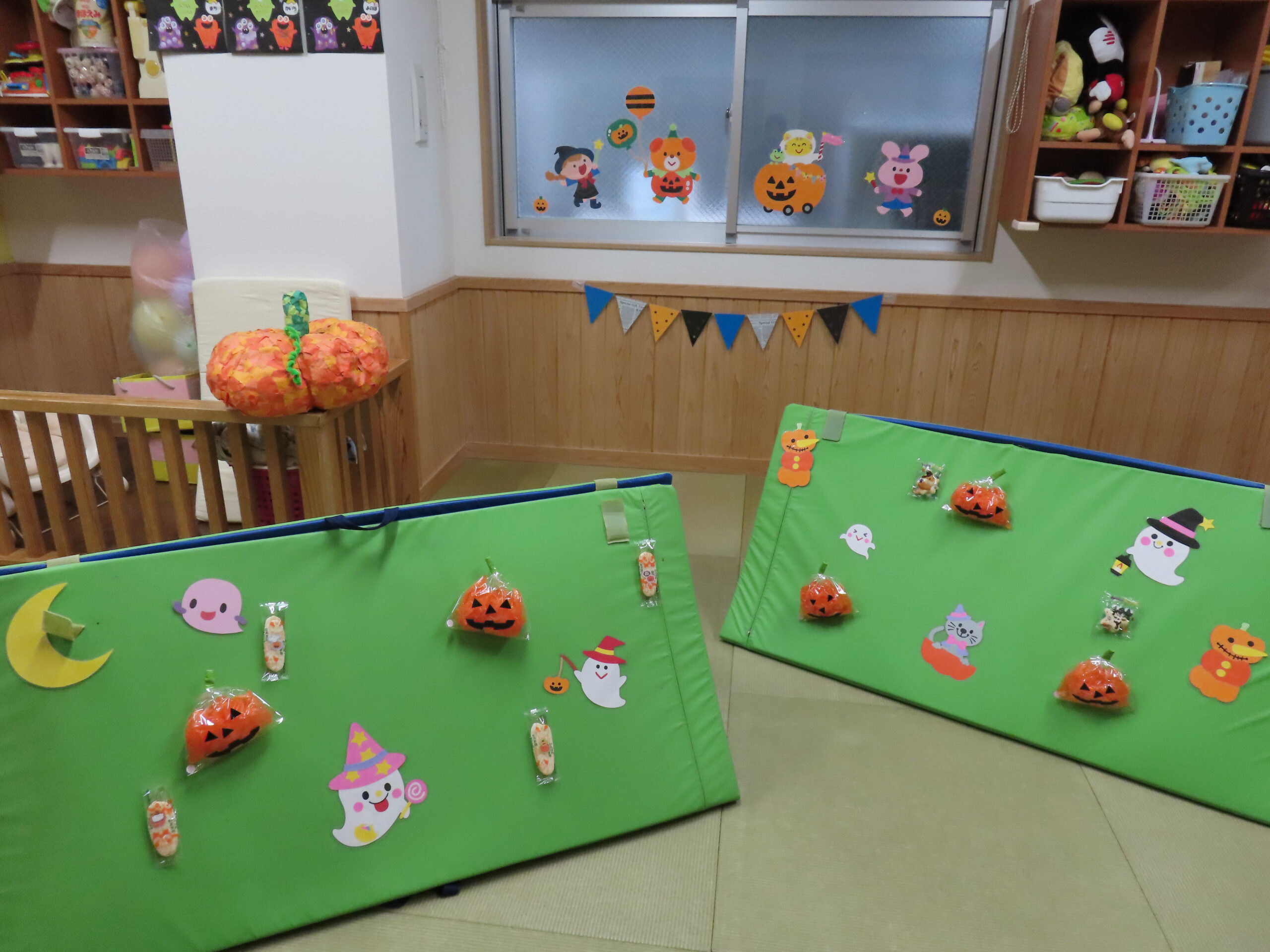 いつものひよこ組さんのお部屋がハロウィン仕様のお菓子畑に変身していて、