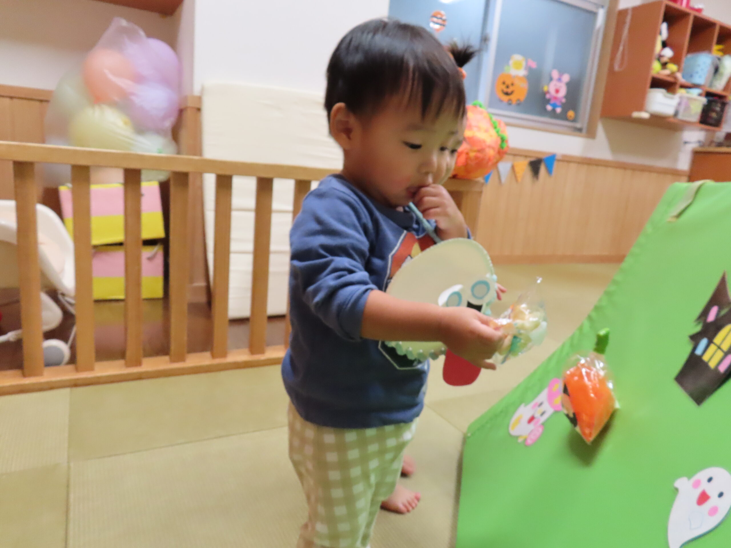 ハロウィンには、「収穫」という意味があるため、みんなでおやつを取りに行こう🍭!と気合いを入れて