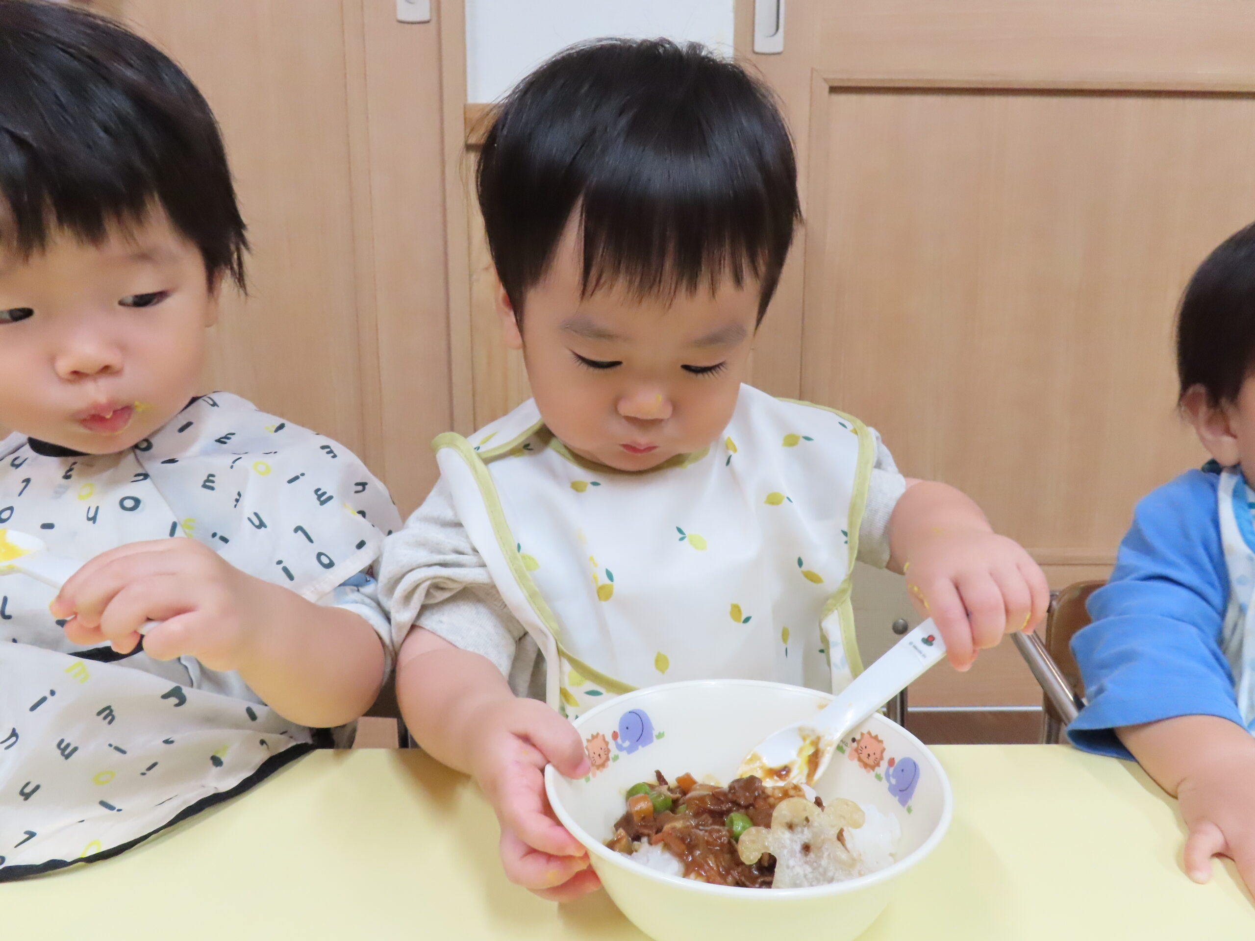 ハヤシライスの上にあるオバケにとても興味を示していましたが、、、