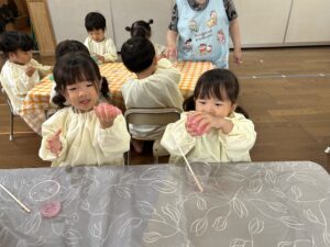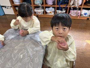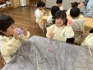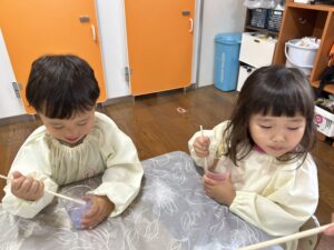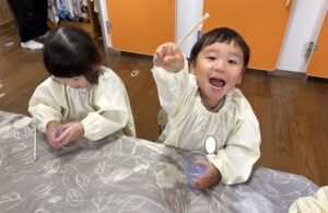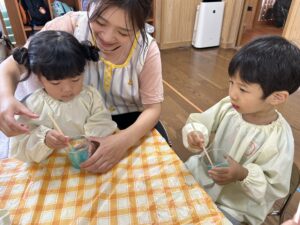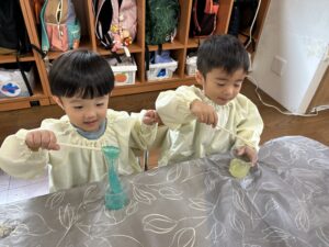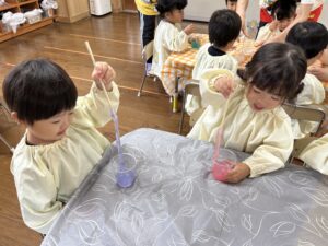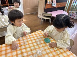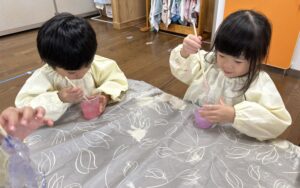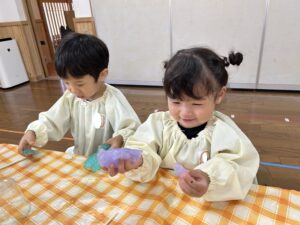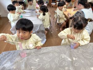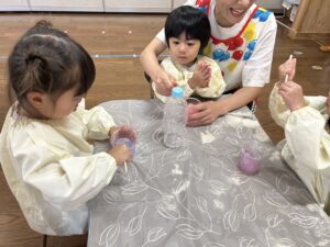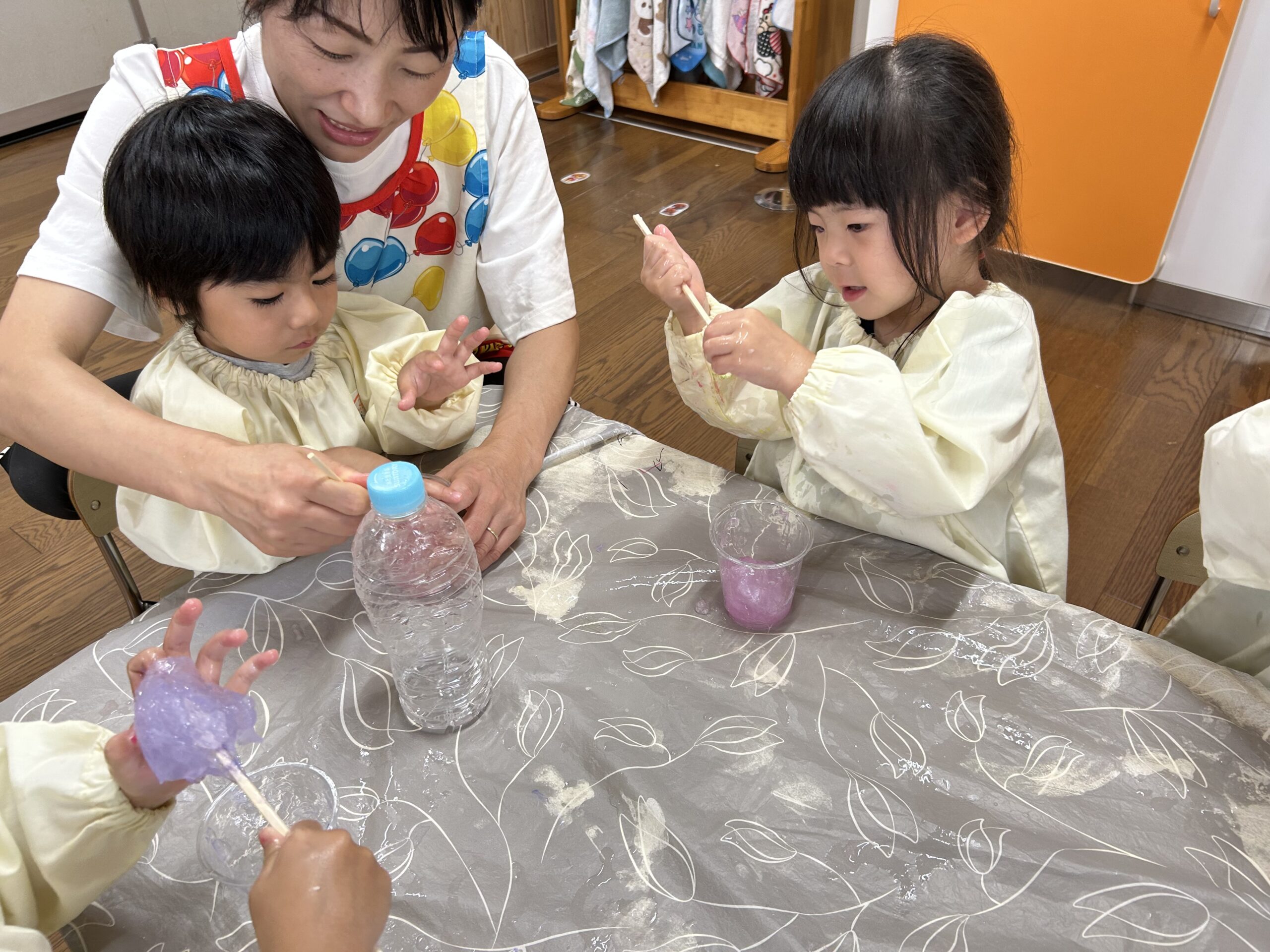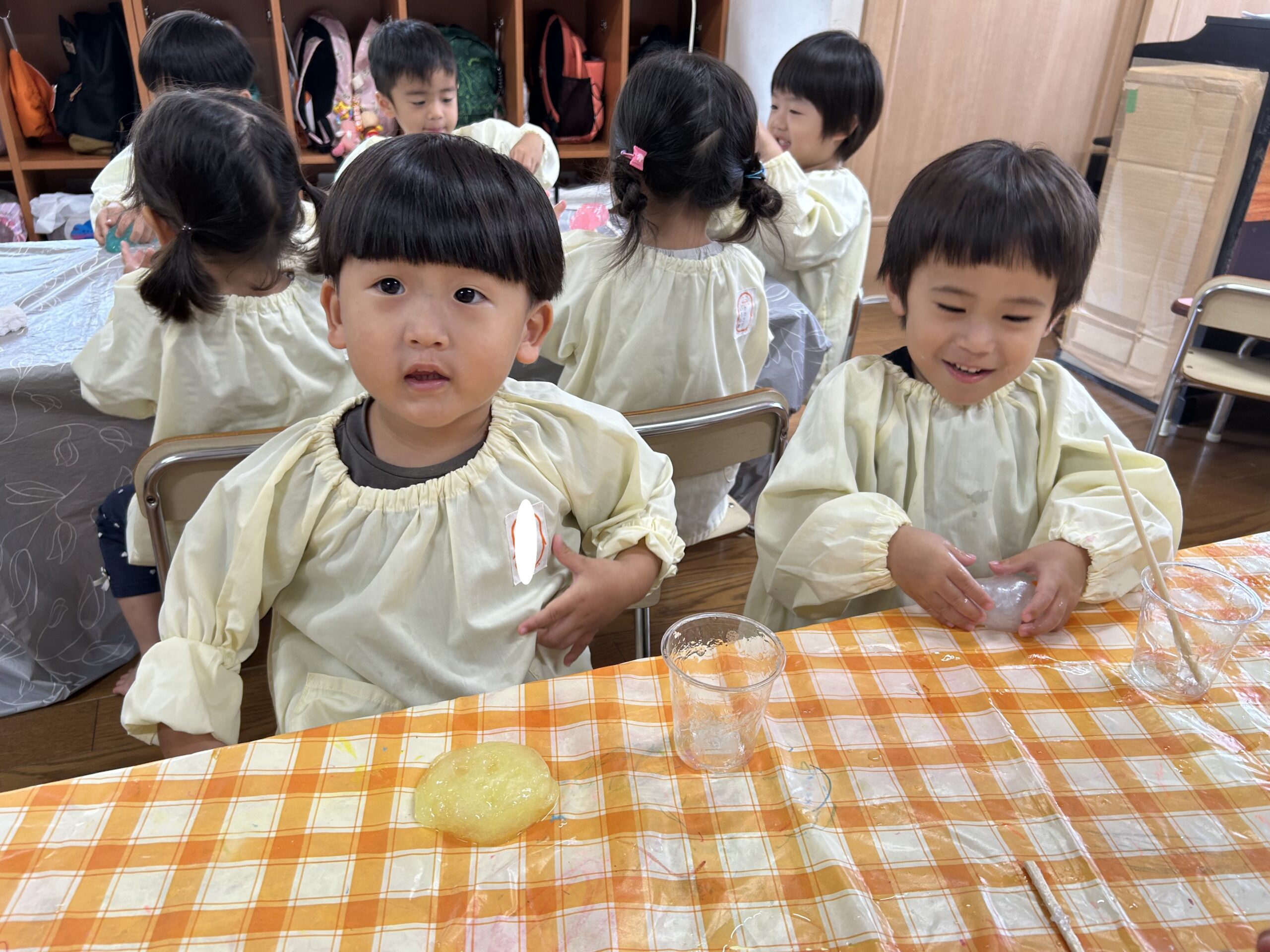 リベンジ❕スライム作り 2025年10月16日 最終更新日時 : 2025年10月16日 w-kchuo 今日は、先日のリベンジでスライム作りをしました😊 材料は、洗濯糊に水を入れて、好きな色の絵の具を入れてよく混ぜました。そこに、ホウ砂水を少しずつ入れると・・・ のび~るのび~る☆ わ~!と歓声を上げていました😊 材料を混ぜることで変化していく様子に興味をもっていましたよ。 丸まってくると、こねこねこねたり、ちぎったり、スライムの感触を味わっていました。 友だちと一緒に作ったり、見せ合ったりしながら、スライムの不思議な感触を楽しんだ一日でした😊 また楽しい遊びを考えていきたいと思います。