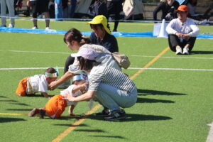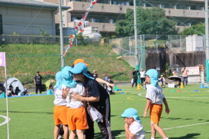 5歳児年長組,ゴールした飛び込んでくる子どもたちを受け止める生生も体力つくりが必要です。最後の運動会,担任の先生に抱きしめられていい思い出になりました。