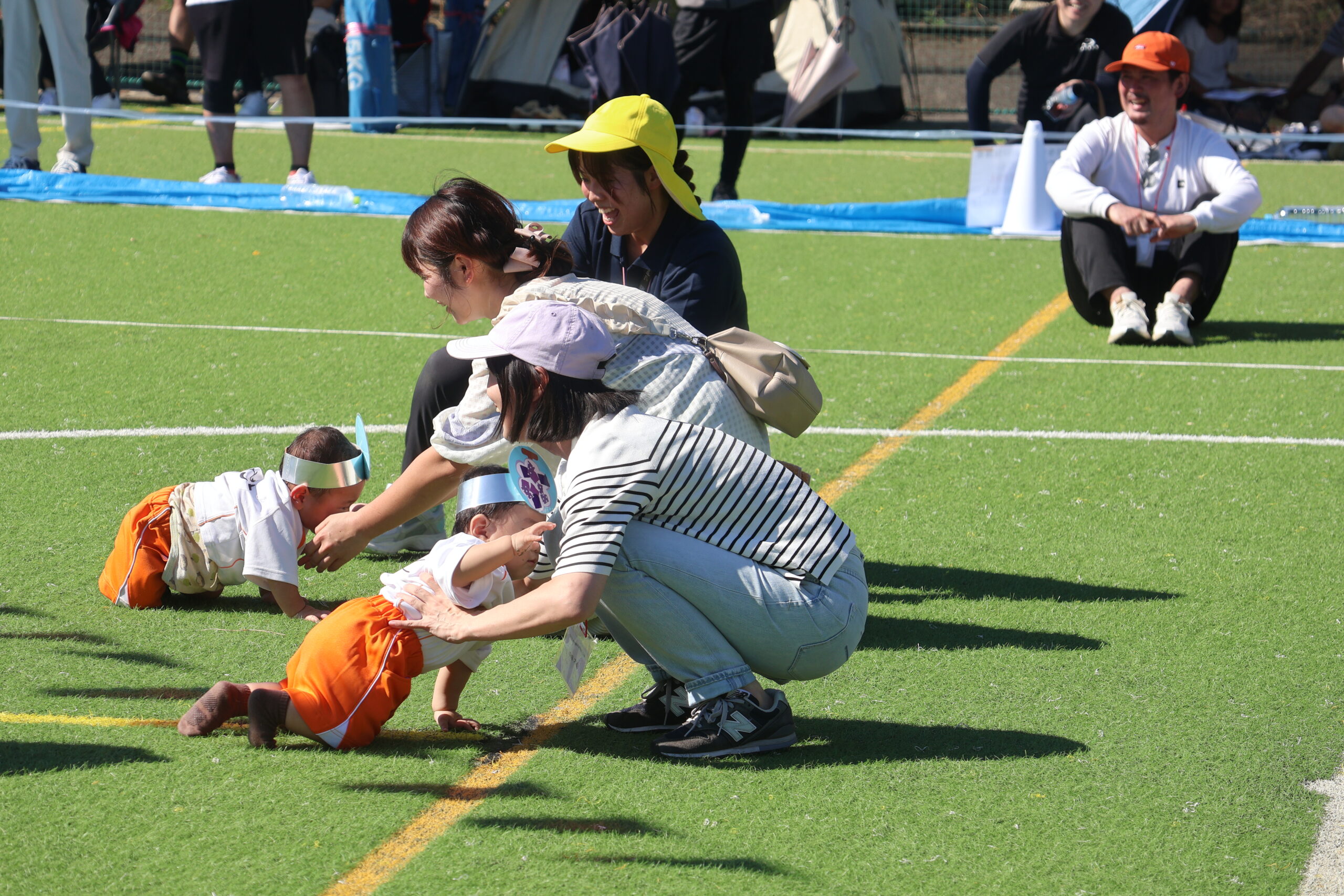 1歳児こあら組の子どもたち,初めてのかけっこです。ゴールまで走れたかな。