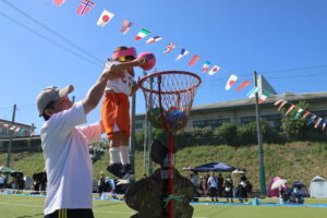 2歳児りす組の親子競技です。お父さんの力を借りて,見事にシュート!