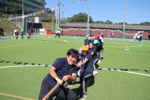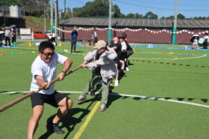 職員チームも参加、ぞう組の保護者の皆さんにはかないませんでしたがとても楽しい綱引きとなったようです。