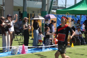 3歳児ぱんだ組は半周より少し長く走ることができました。先生をめざしてゴール。「ゴールまで走れたよ」