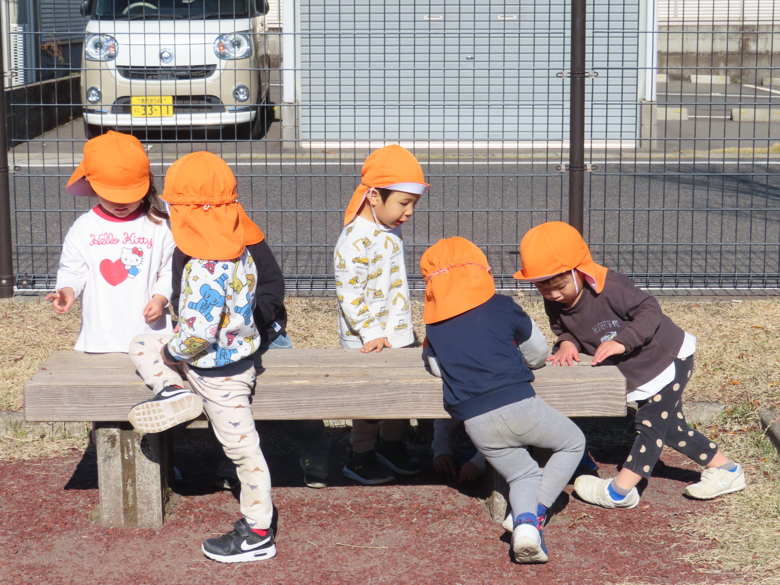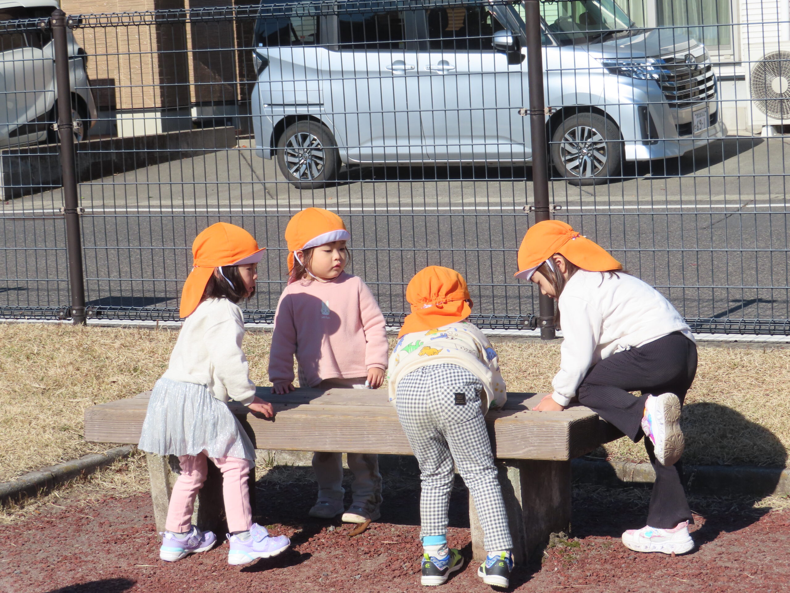 ベンチでは、「トミカやさん」「ごはんやさん」に分かれてつもり遊びをしていましたよ。