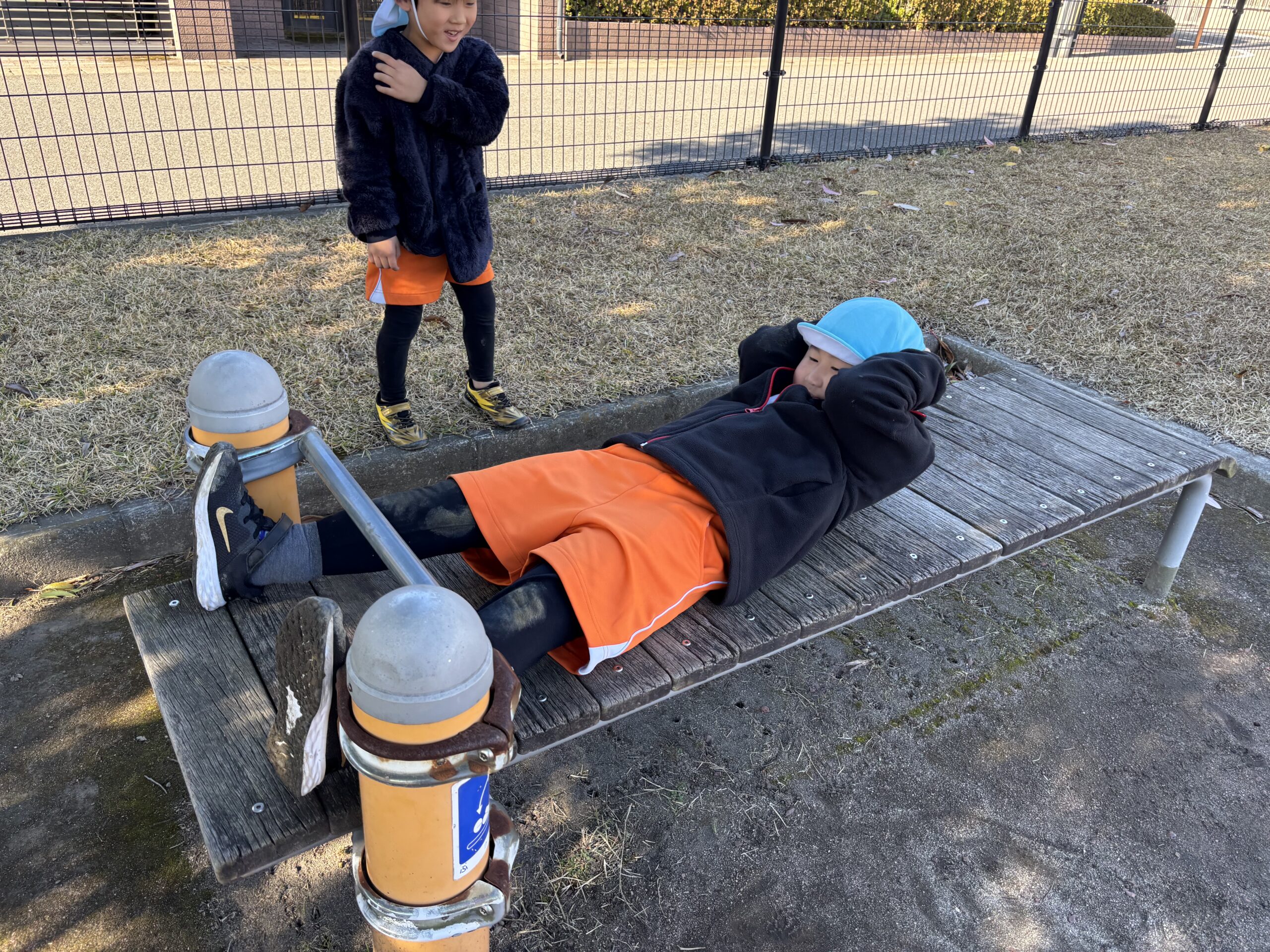 健康遊具で腹筋をするお友だち😊「筋肉ついたかな~」と言っていましたよ(笑)