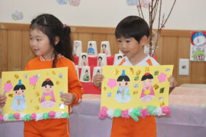 各クラス2名ずつ、ひなまつり制作の発表をしました。