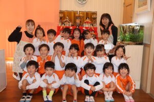 玄関に飾ってある7段飾りの雛人形の前でクラス写真を