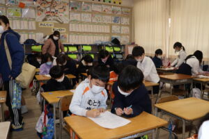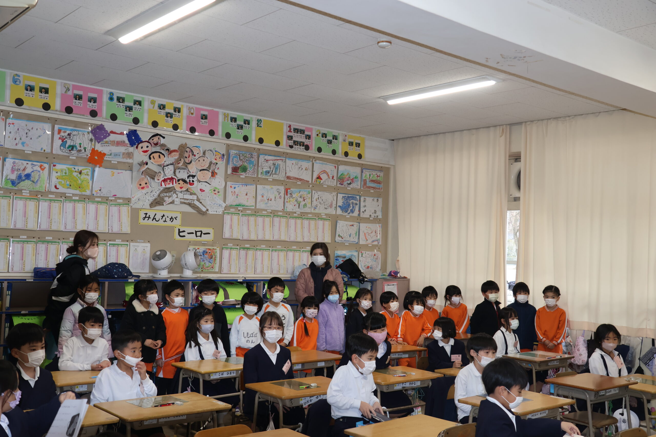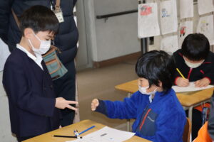 一年生の教室の後ろから国語の授業をみさせてもらいました。一人机がこども園とちがうな。もじかずくらぶとにているところもあるかな?
