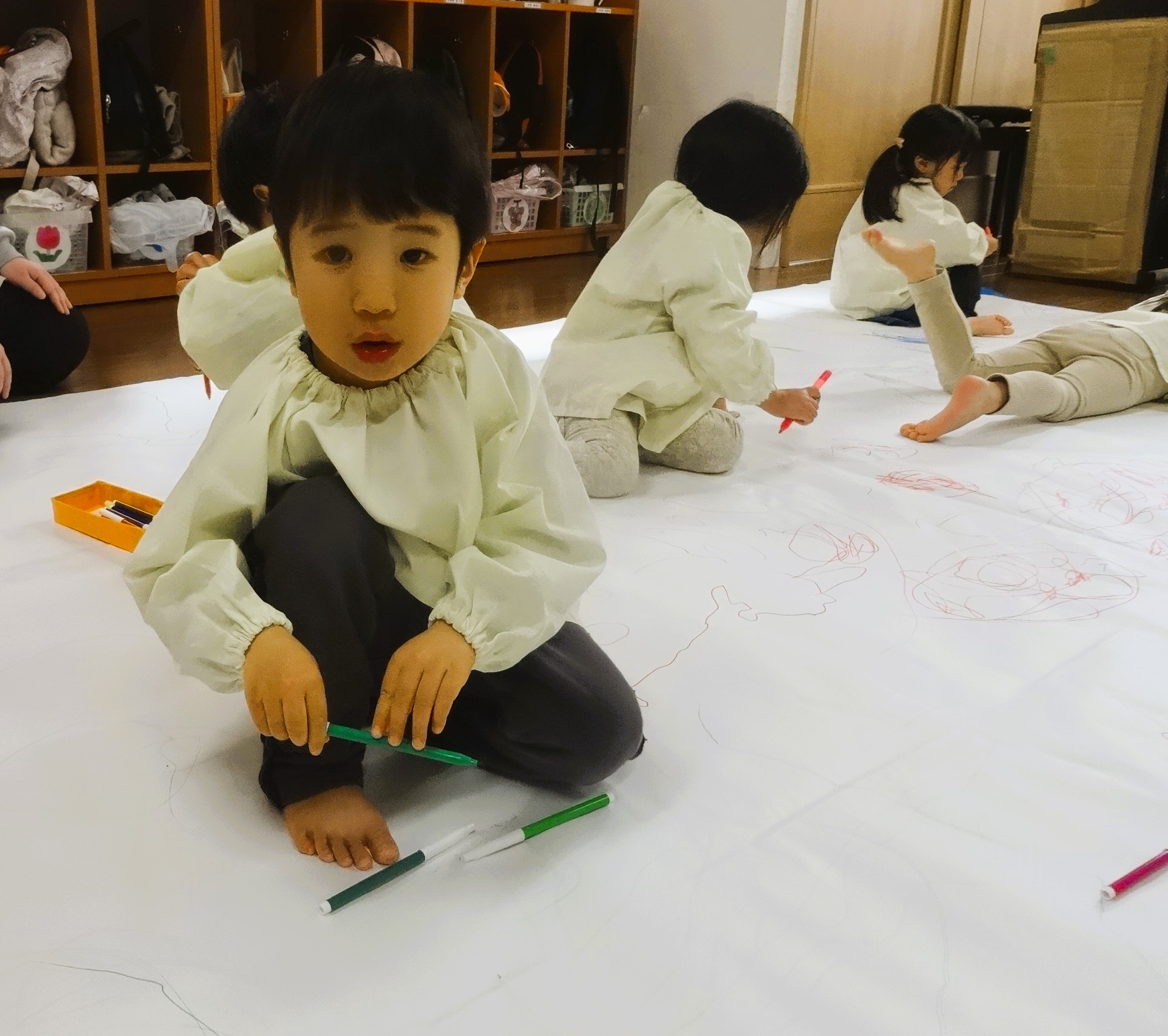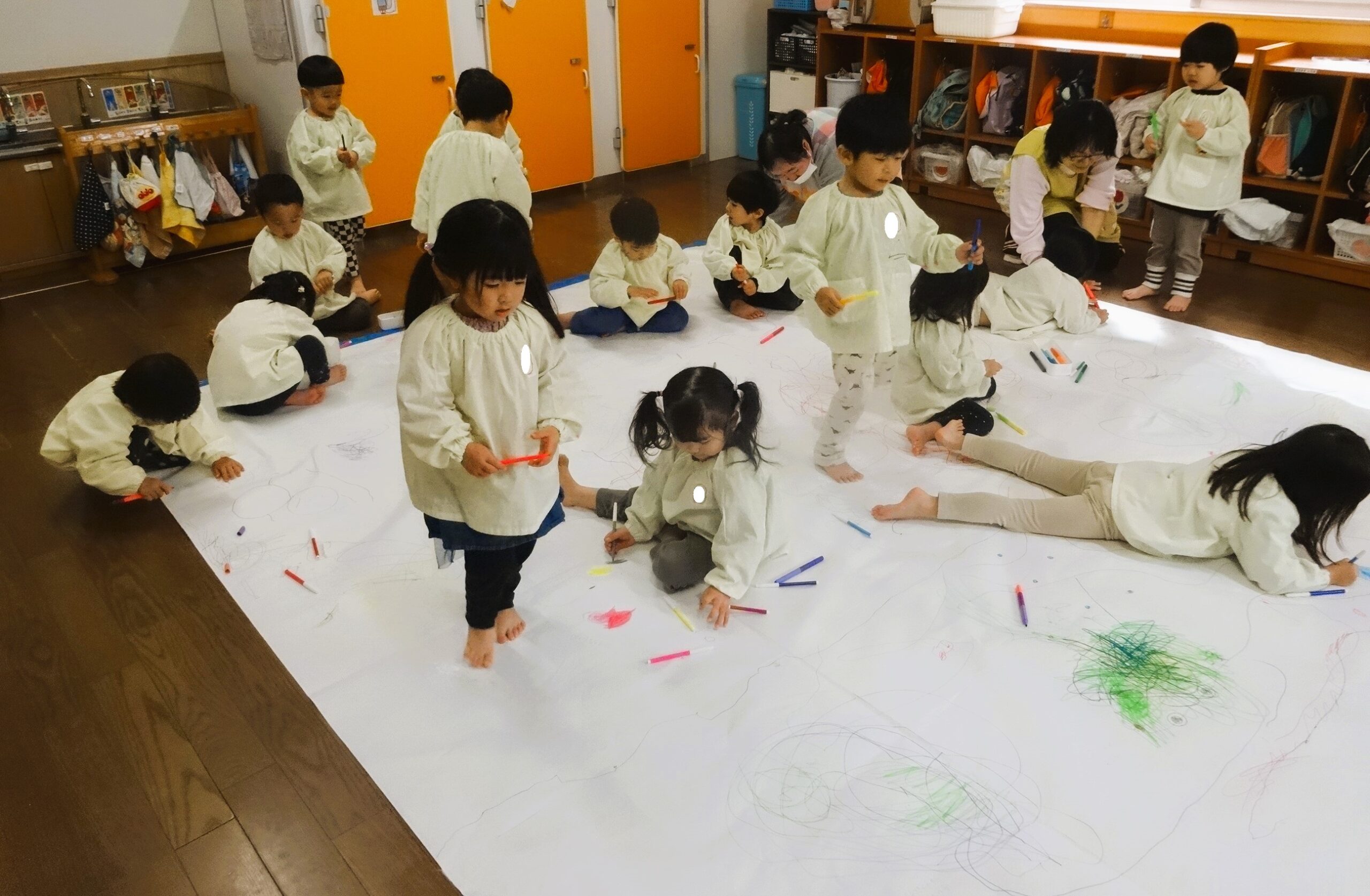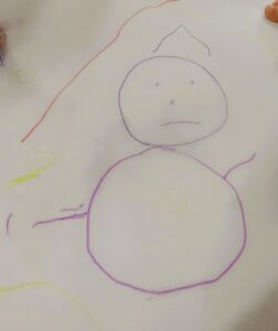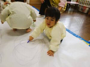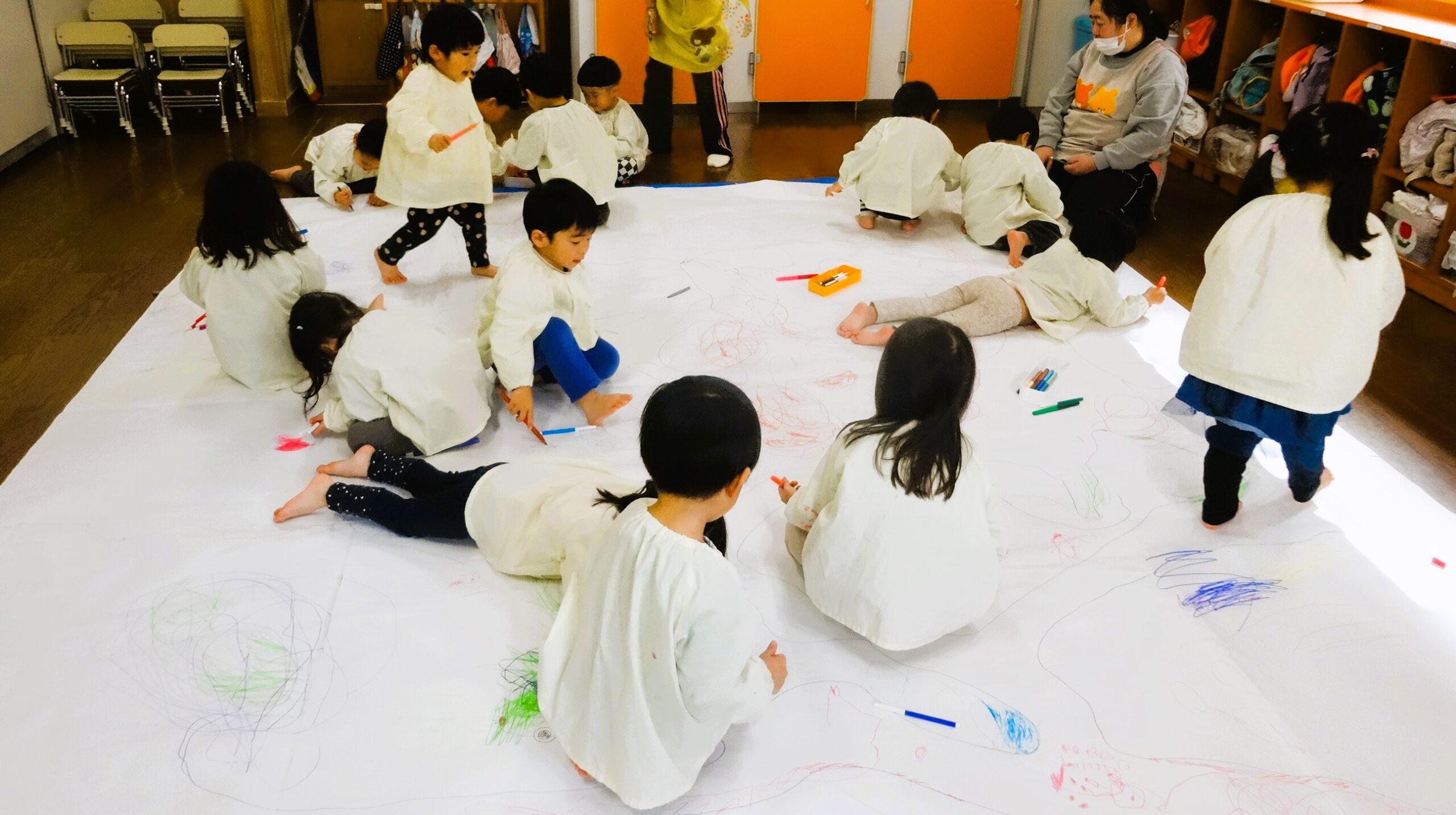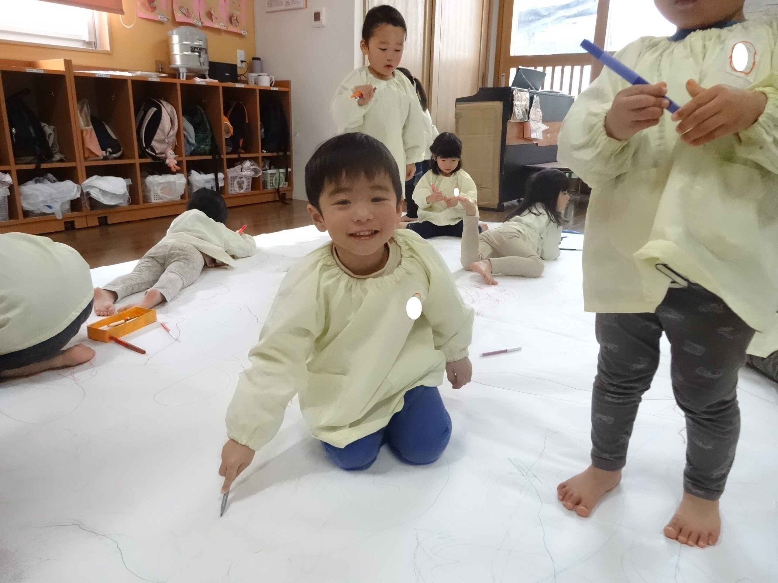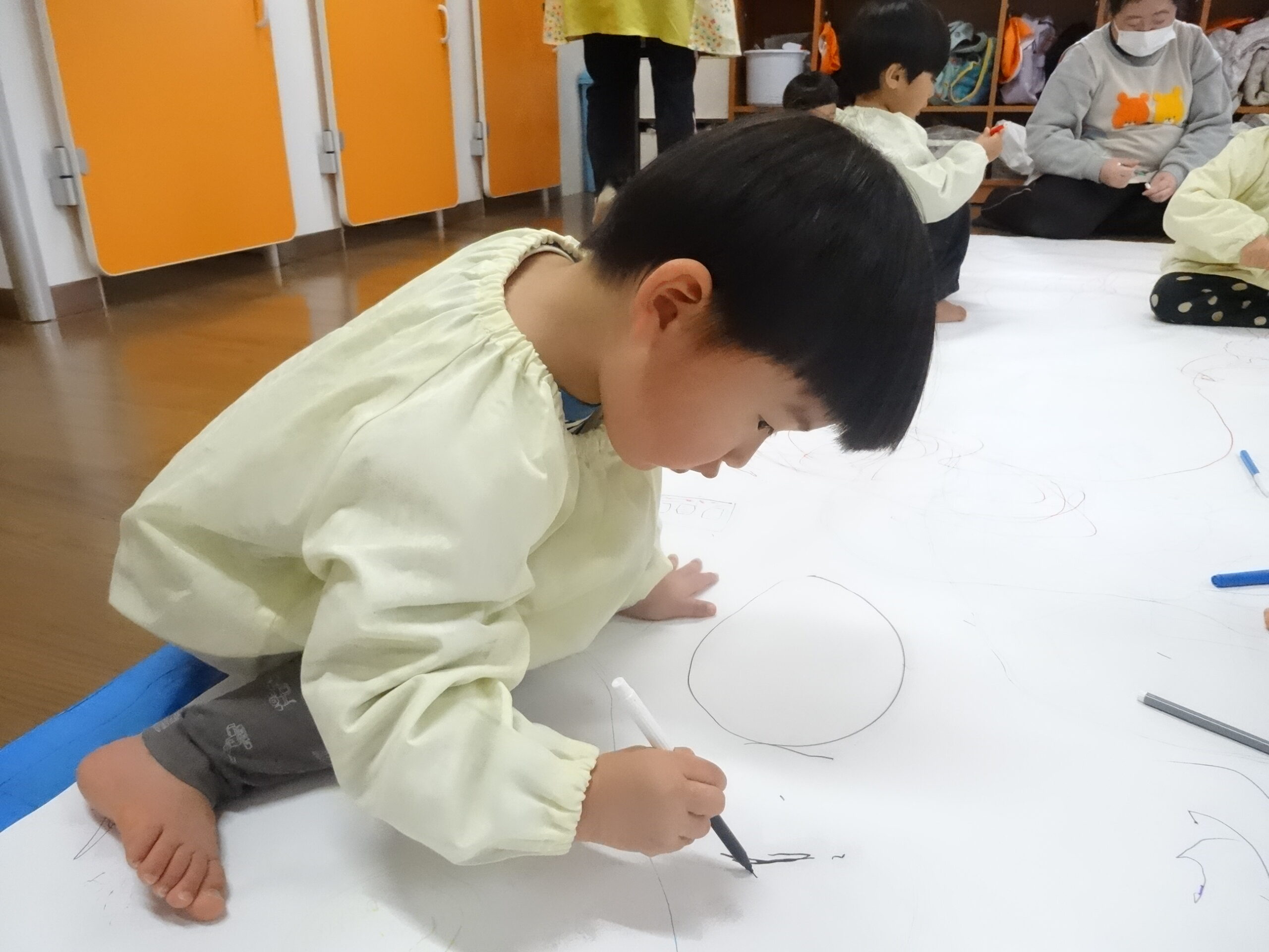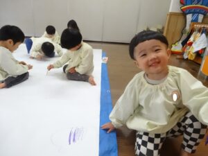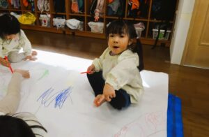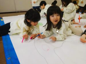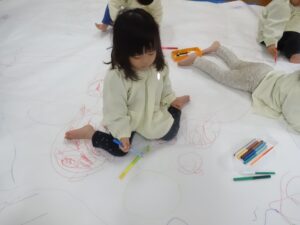 今日は、模造紙という大きなキャンパスに雪遊びのお絵描きをしました。