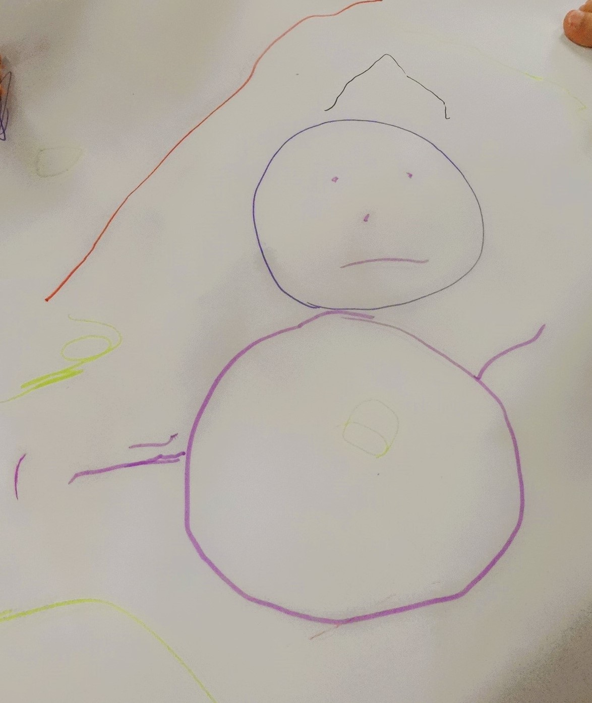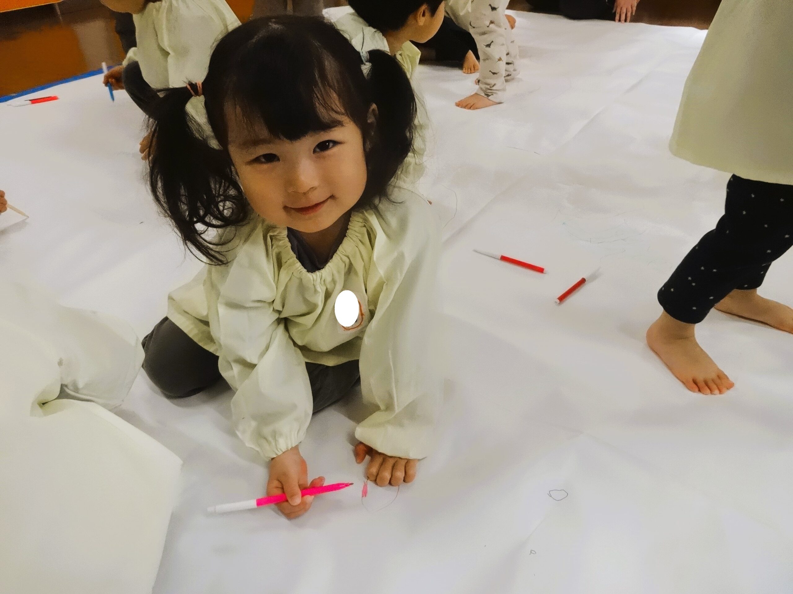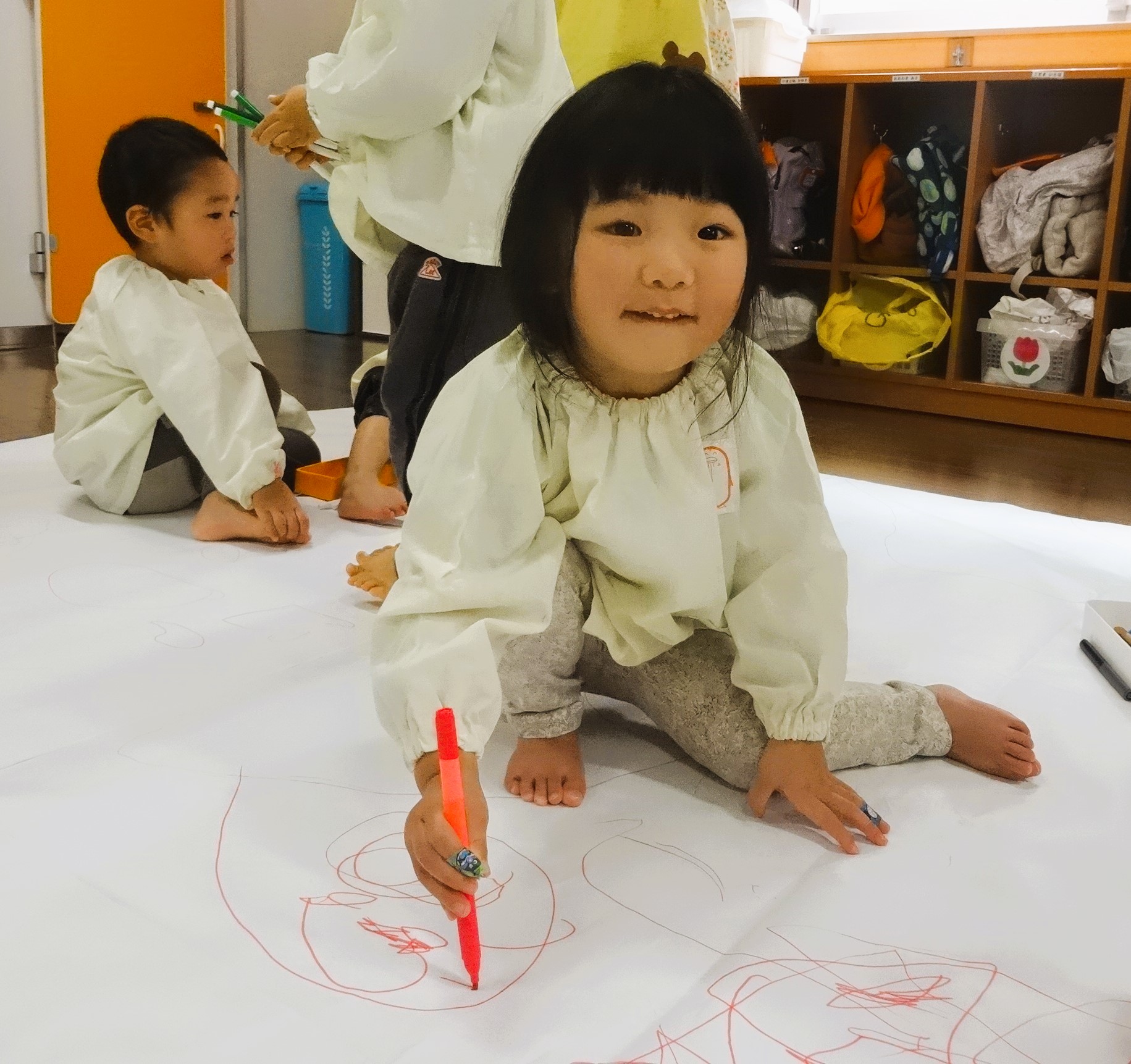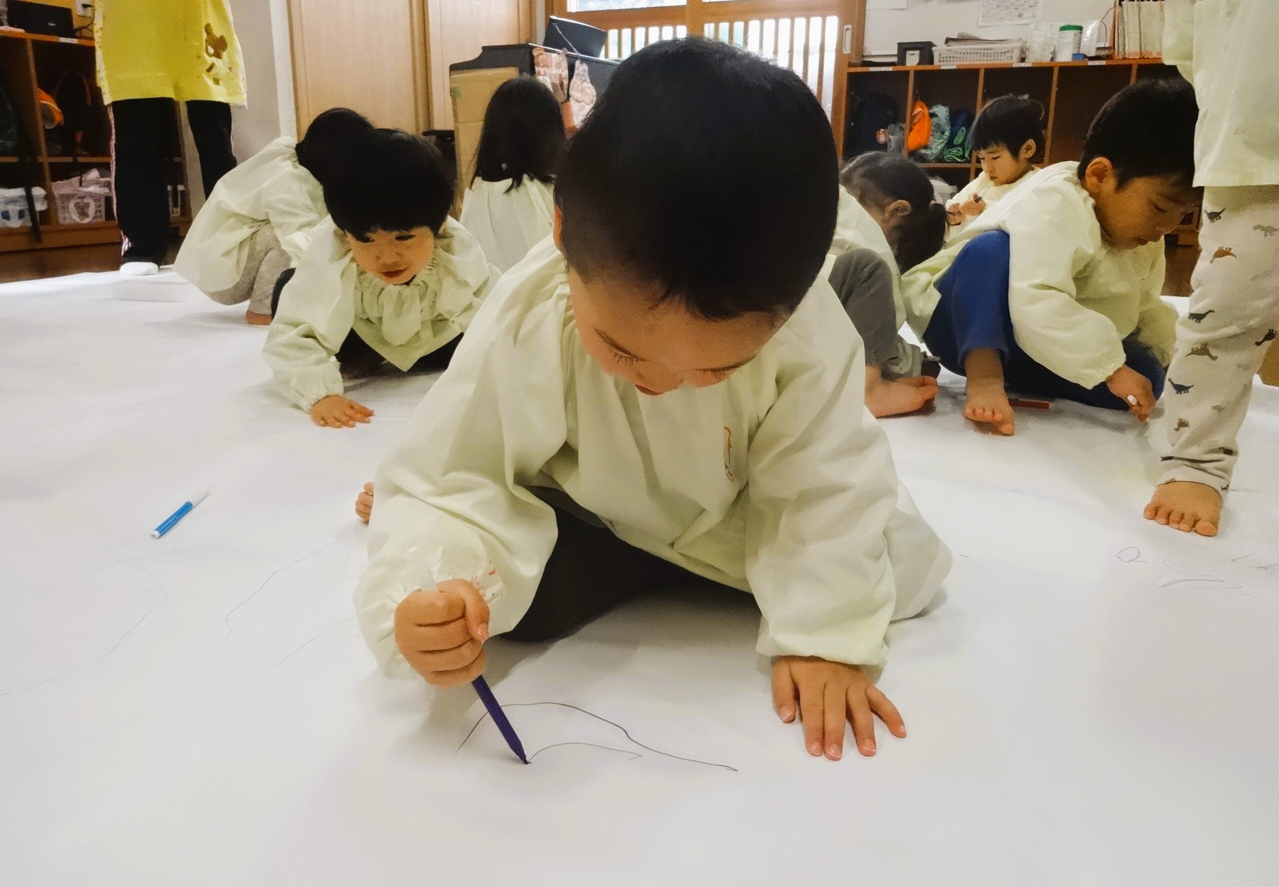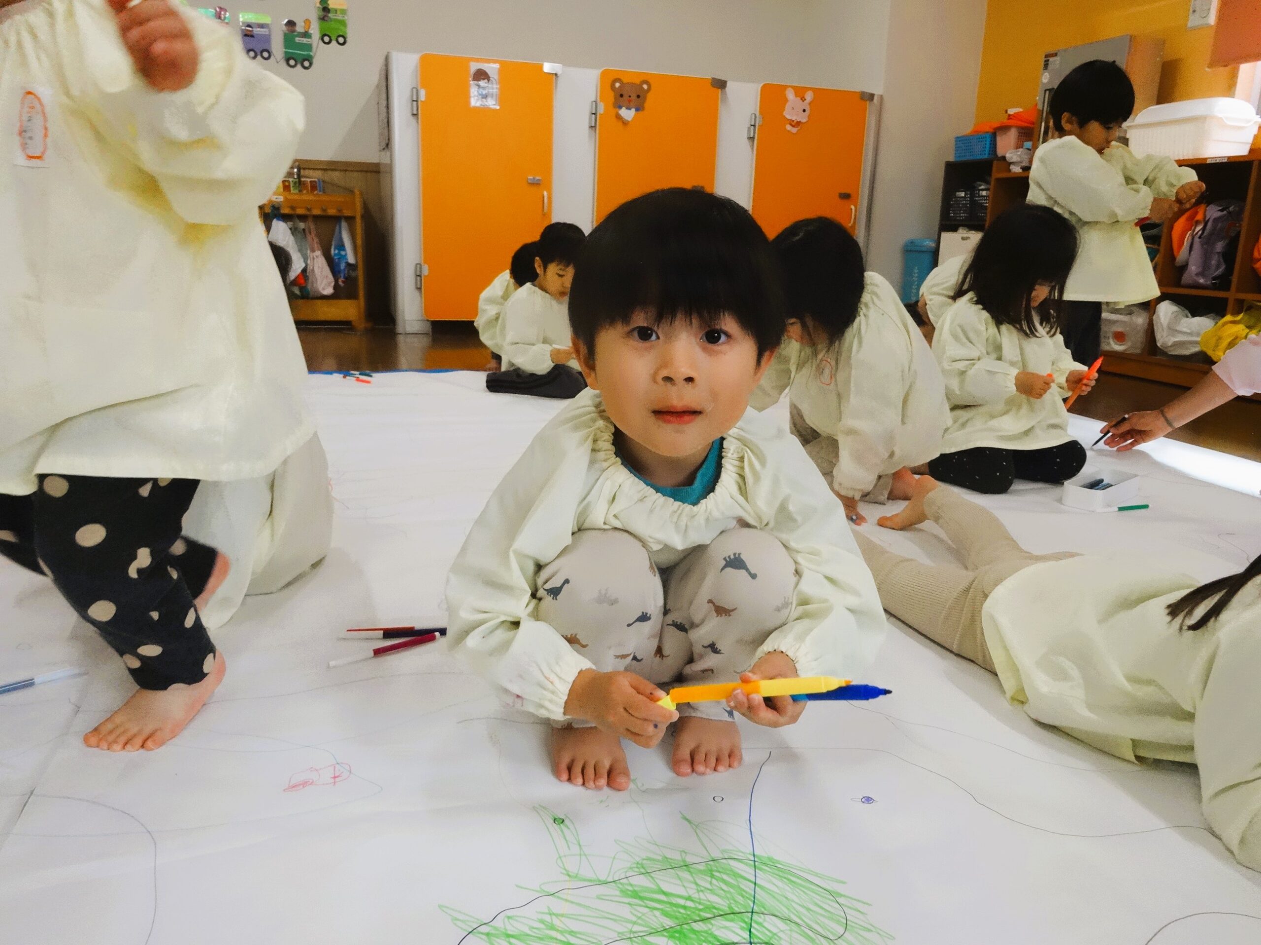 今日は、模造紙という大きなキャンパスに雪遊びのお絵描きをしました。
