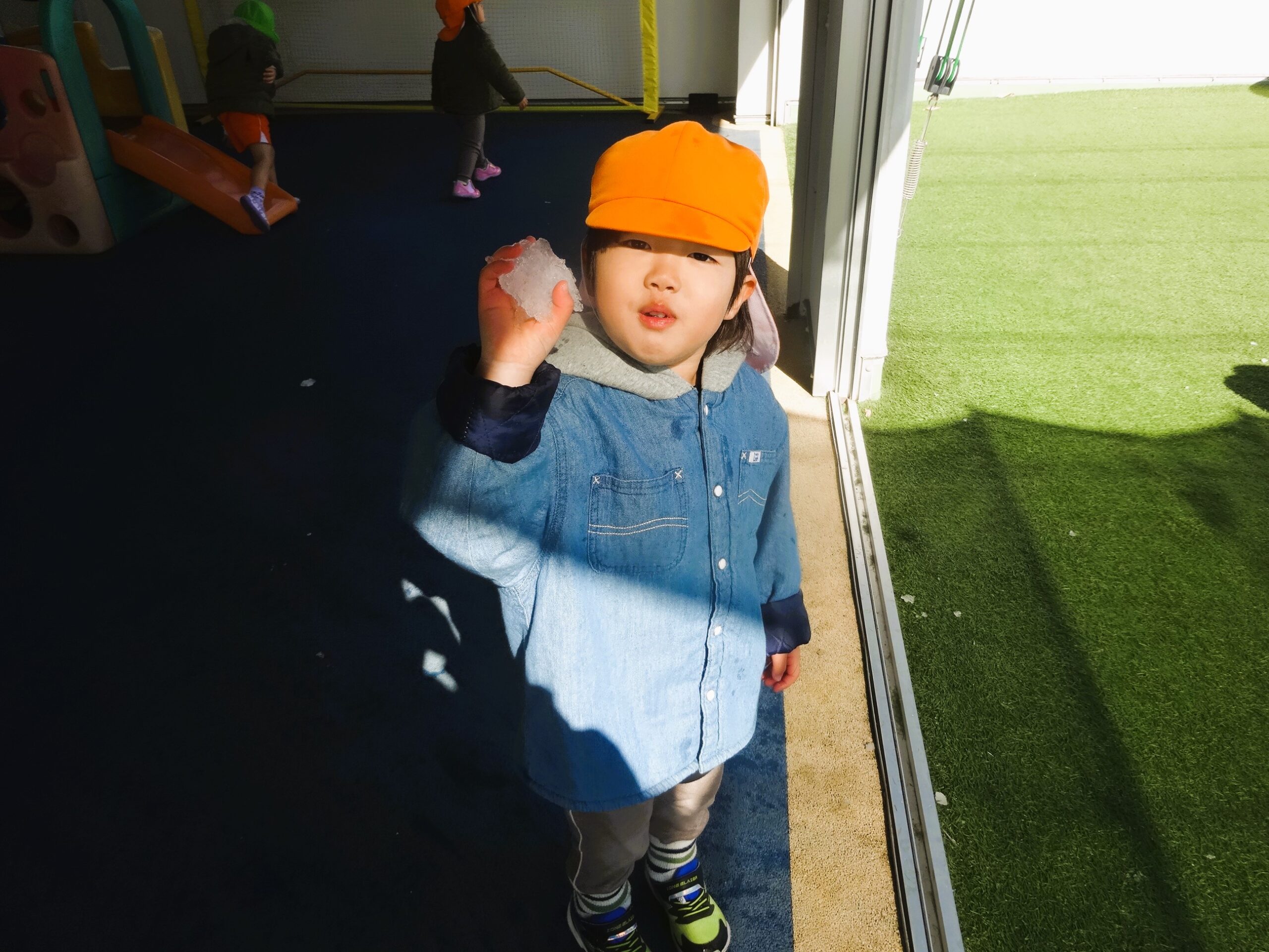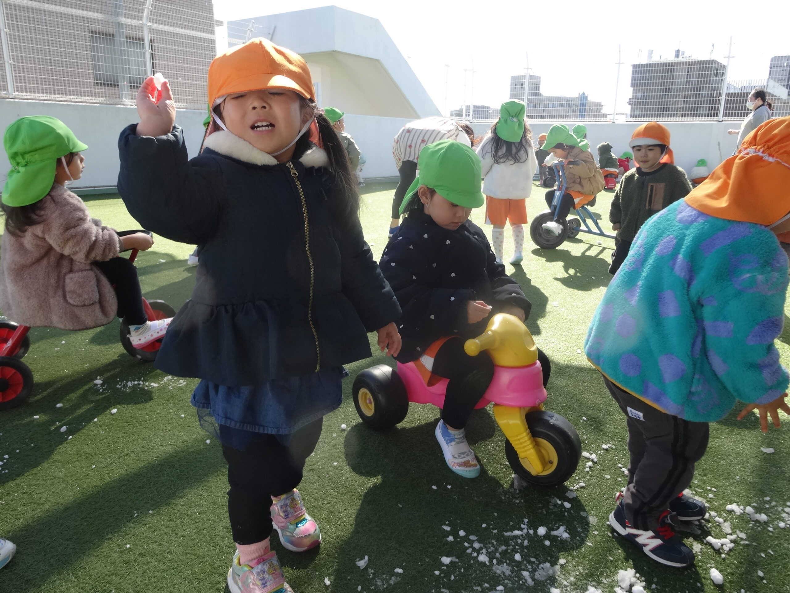 屋上に行くと、まだ雪が残っていて大興奮でした😊