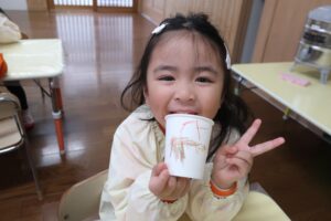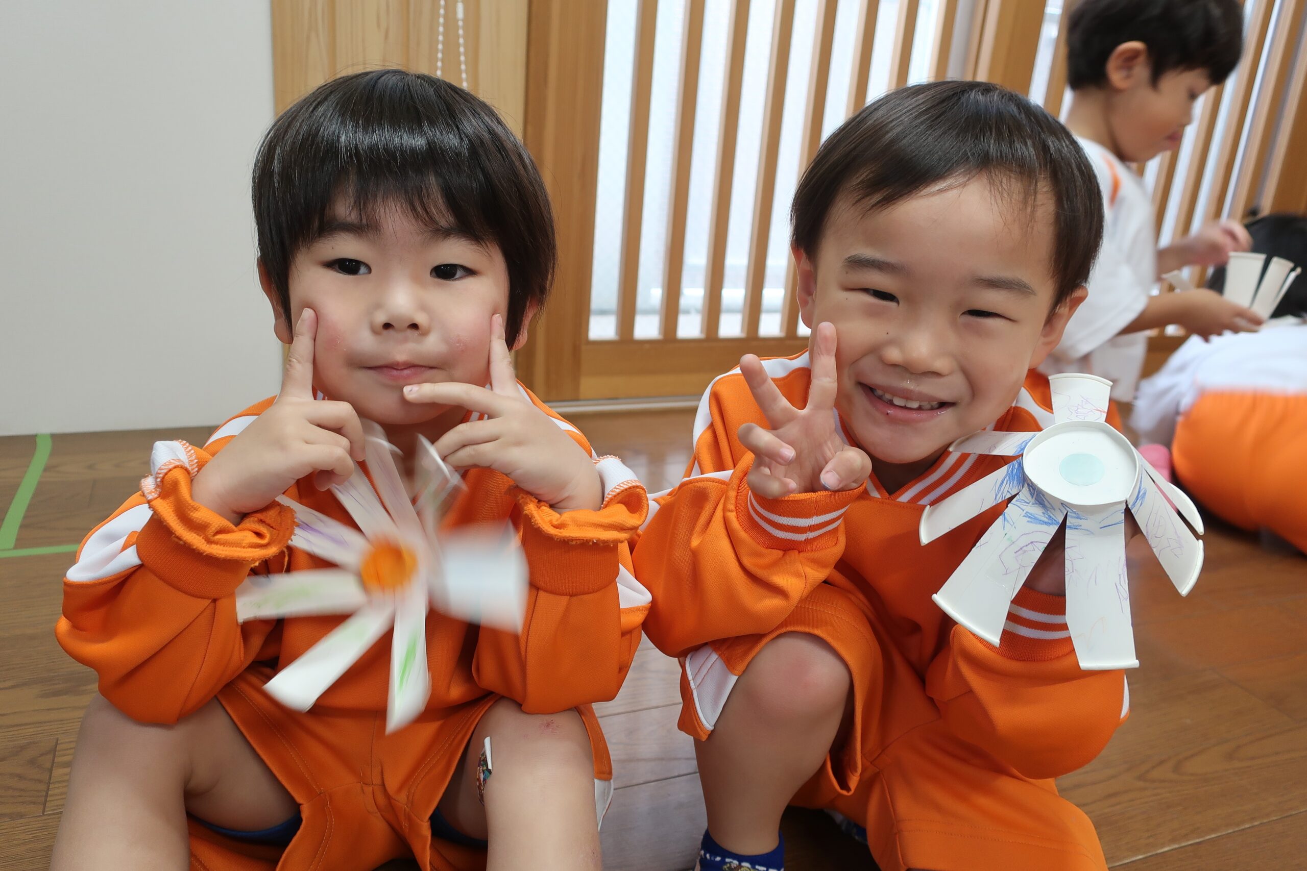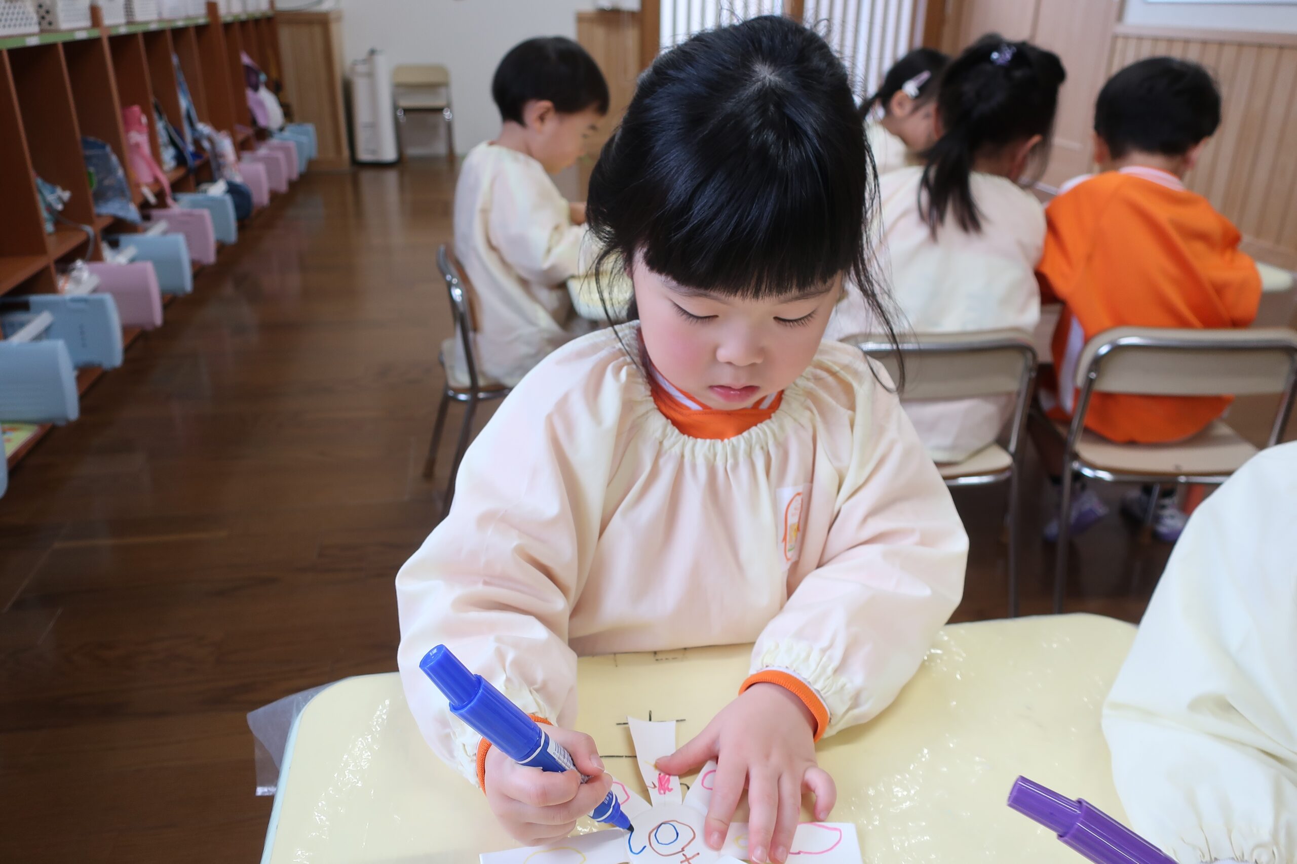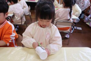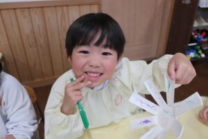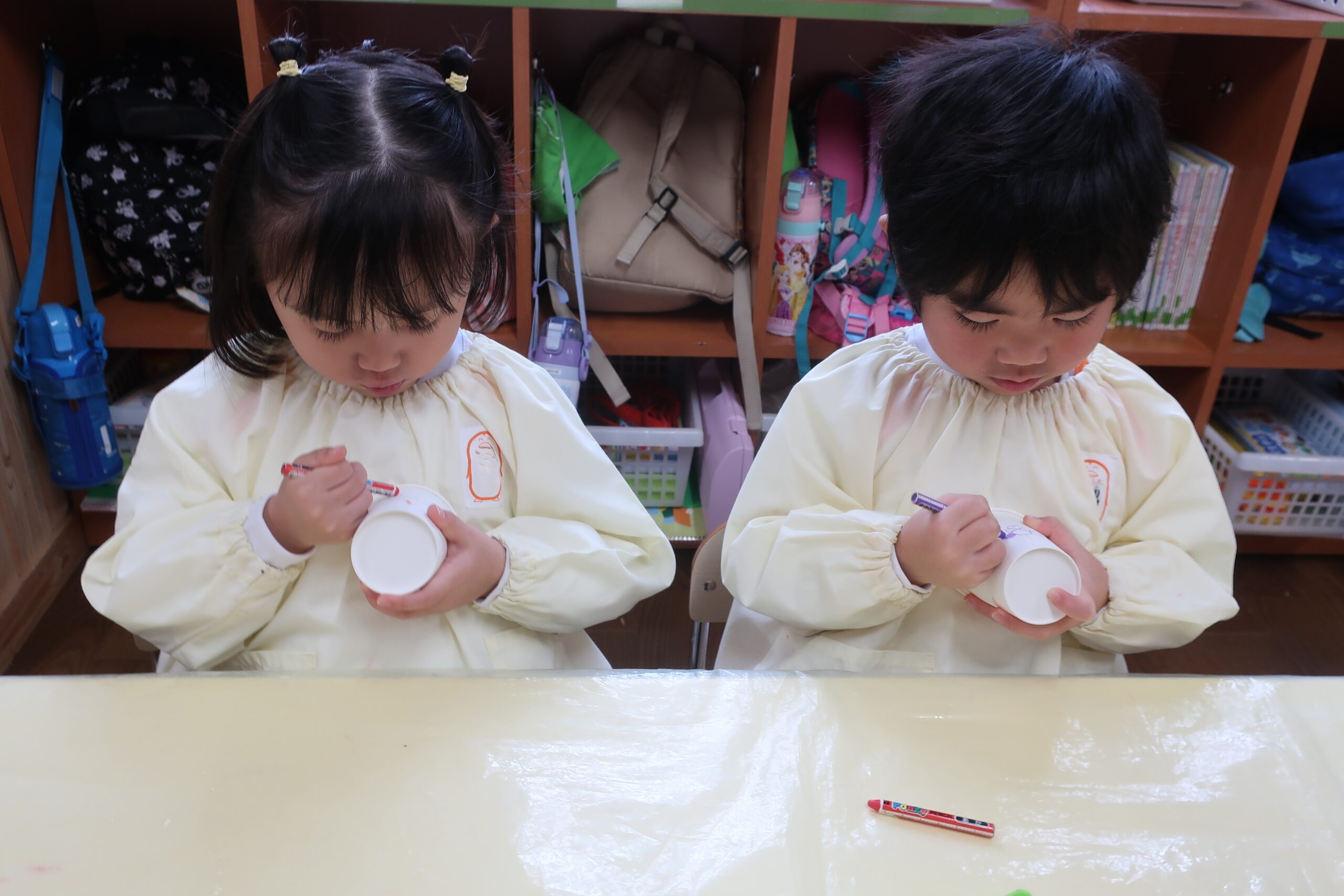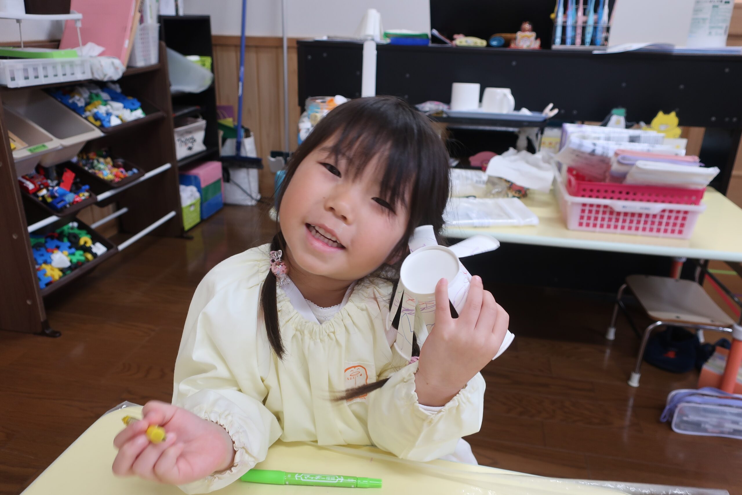 お絵描きが終わった後は、ペットボトルのキャップを先生につけてもらい、完成です🙌🏻💫