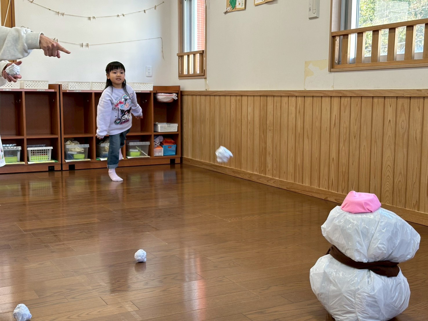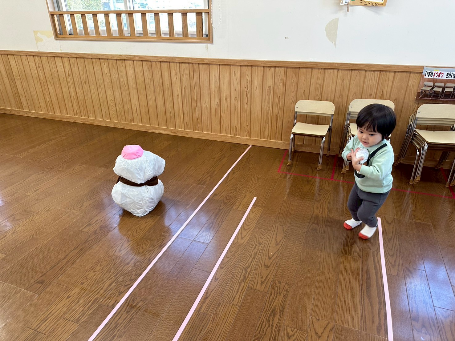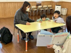 お歌を歌った後は、『ねずみくんのゆきだるま』の絵本を見ました。