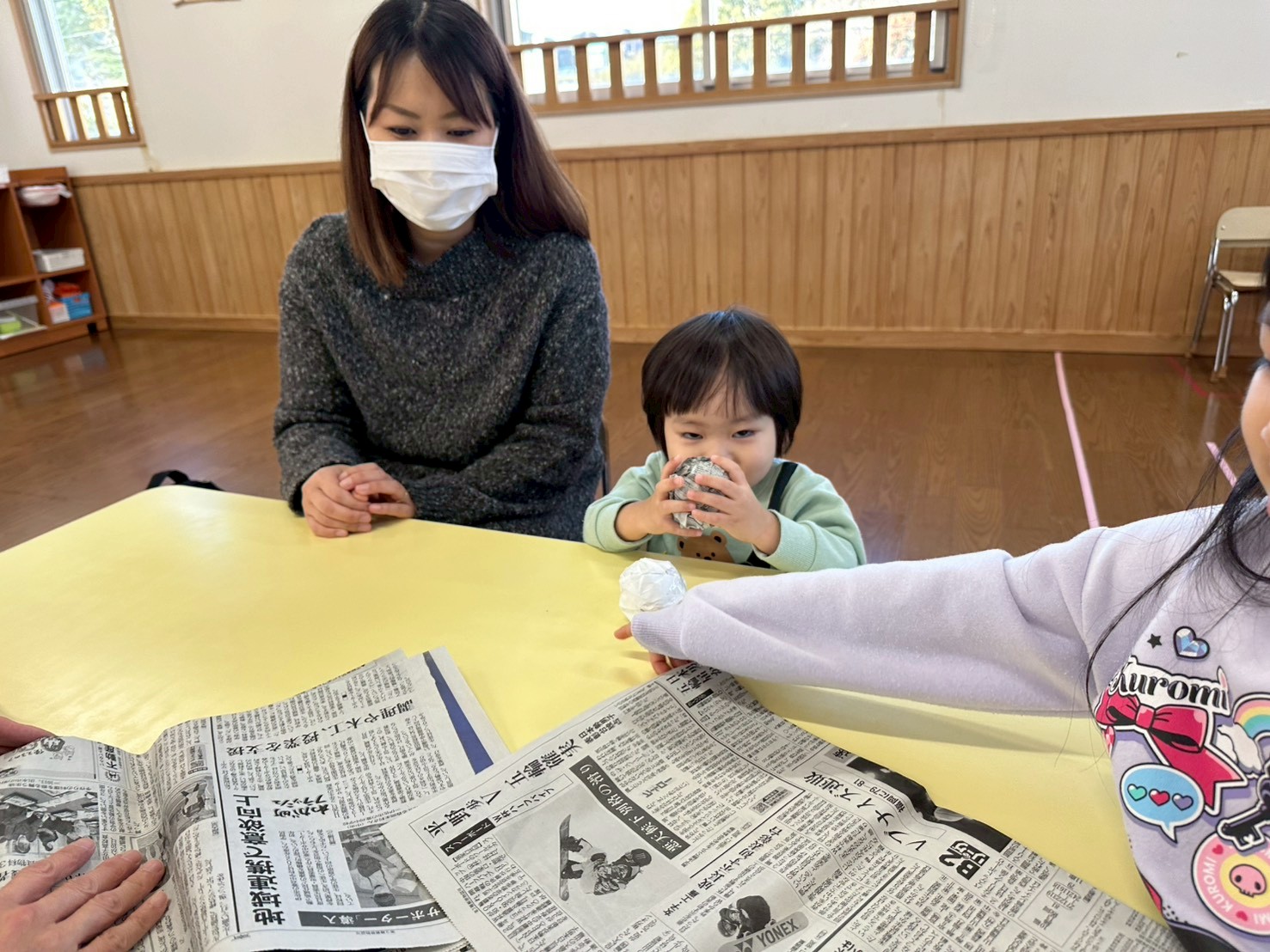 雪のイメージが膨らんできたので、新聞紙を丸めてボールを作りますよ。