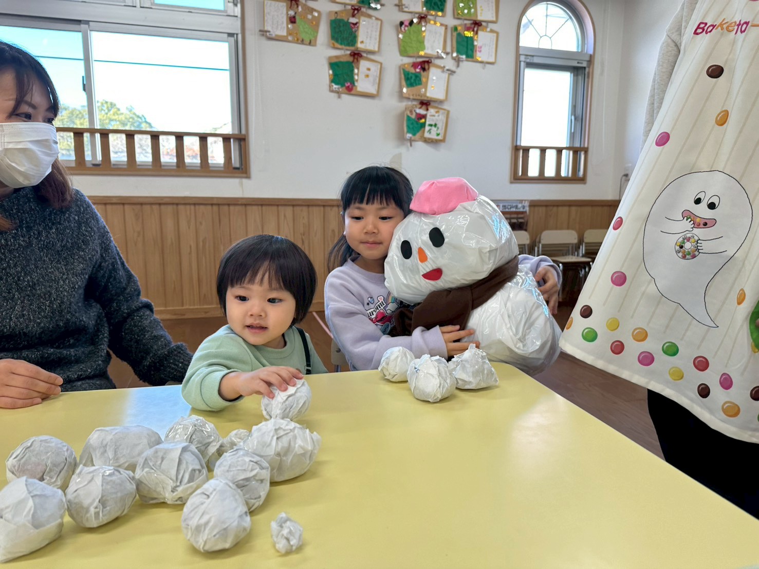 障子紙を巻いて雪玉を完成!たくさん雪玉が出来ました☺