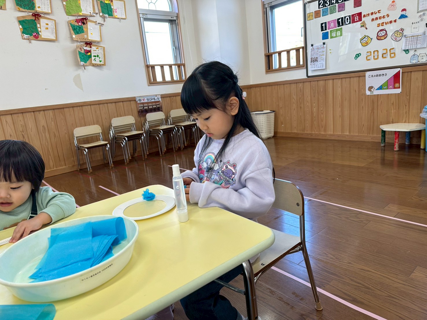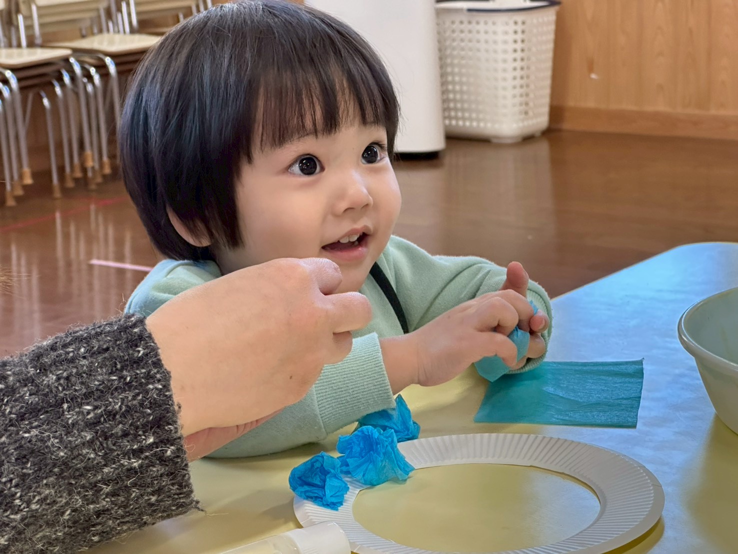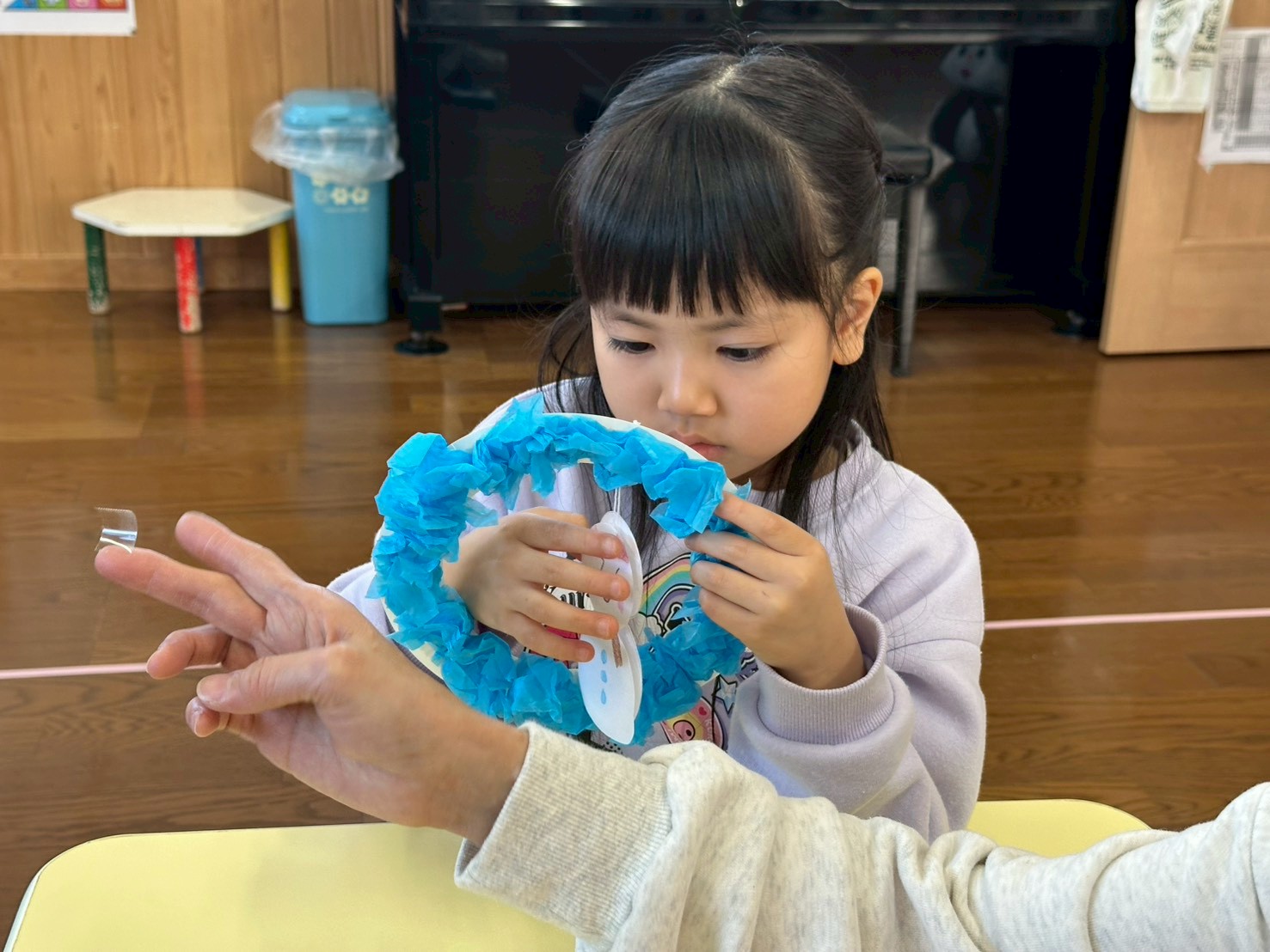 お花紙を丸めて紙皿にペタペタ貼りました。