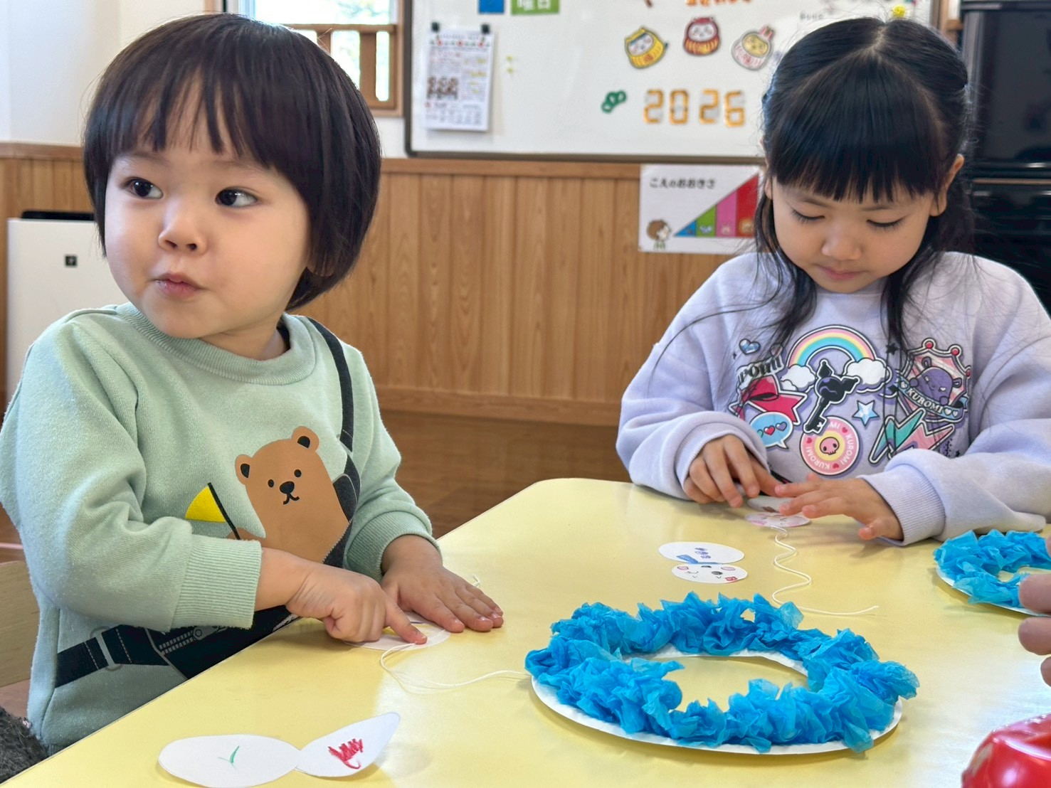 雪合戦も楽しんだので、『雪だるまリース』を作りました。